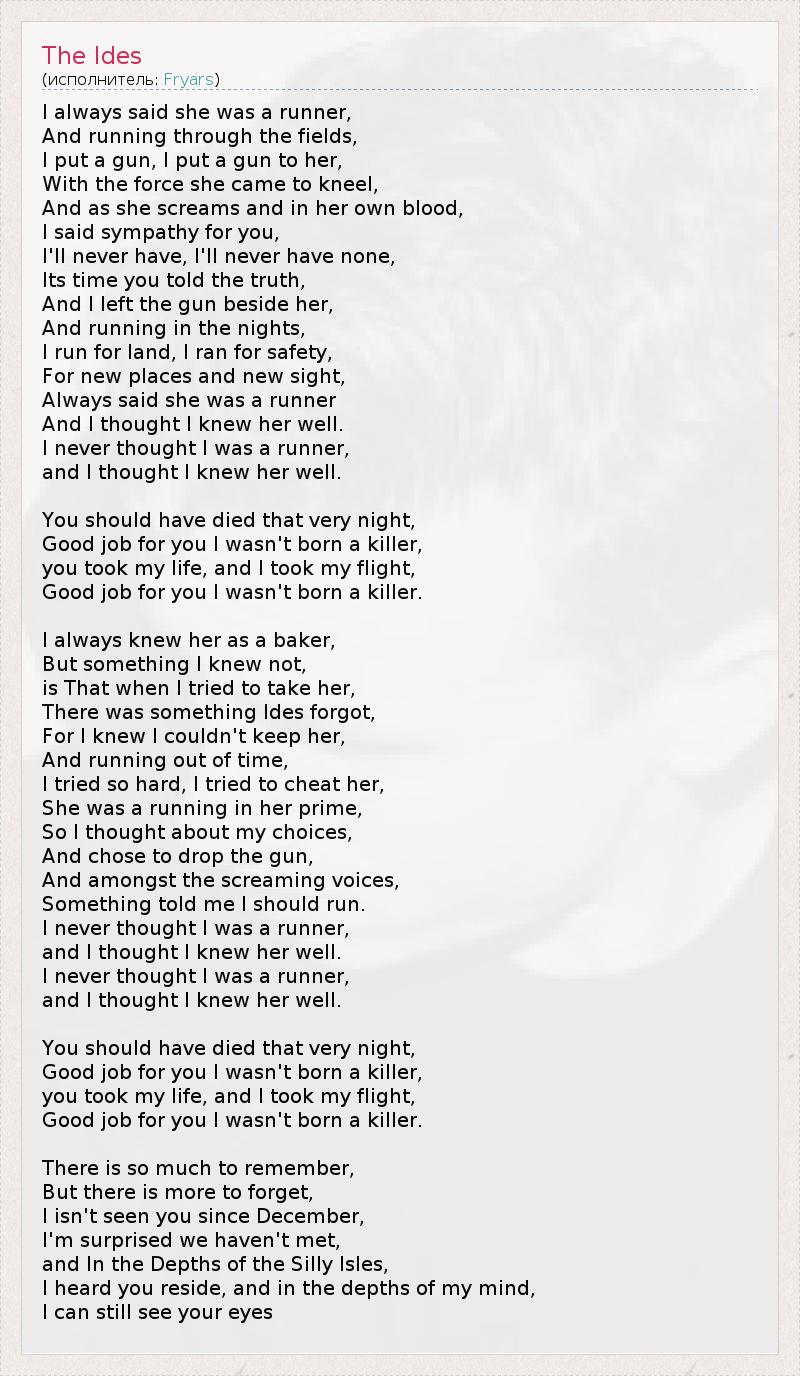Я всегда говорил, что она бегун, И бегать по полям, Я положил пистолет, я приставил пистолет к ней, С силой она пришла становиться на колени, И как она кричит и в ее собственной кровью, Я сказал симпатию к вам, Я никогда не буду есть, я никогда не буду иметь ни одного, Его время вы сказали правду, И я оставил пистолет рядом с ней, И бегать по ночам, Я бегу за землю, я побежал в целях безопасности, Для новых мест и новым взглядом, Всегда говорил, что она была бегун И я думал, что я хорошо ее знал. Я никогда не думал, что я был бегуном, и я думал, что я хорошо ее знал. Вы должны были умереть в ту же ночь, Хорошая работа для вас я не родился убийца, Вы взяли мою жизнь, и я взял мой полет, Хорошая работа для вас я не родился убийцей. Я всегда знал ее как пекарь, Но что-то я не знал, что что, когда я попытался взять ее, Был то иды забыл, Ибо я знал, что я не мог держать ее, И не хватает времени, Я так старался, я пытался обмануть ее, Она была работает в расцвете сил, Так что я думал о своем выборе, И решил отказаться от пушки, И среди кричащих голосов, Что-то подсказывало мне, что я должен работать. Я никогда не думал, что я был бегуном, и я думал, что я хорошо ее знал. Я никогда не думал, что я был бегуном, и я думал, что я хорошо ее знал. Вы должны были умереть в ту же ночь, Хорошая работа для вас я не родился убийца, Вы взяли мою жизнь, и я взял мой полет, Хорошая работа для вас я не родился убийцей. Существует так много, чтобы помнить, Но это еще не забывать, Я не видел тебя с декабря, Я удивлен, что мы не встретились, а в глубине глупого островах, Я слышал, что вы проживаете, а в глубине моего сознания, Я до сих пор вижу твои глаза
