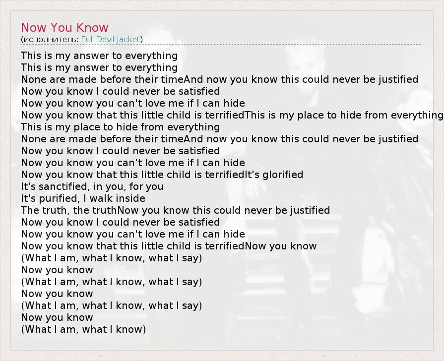 This is my answer to everything This is my answer to everything None are made before their timeAnd now you know this could never be justified Now you know I could never be satisfied Now you know you can't love me if I can hide Now you know that this little child is terrifiedThis is my place to hide from everything This is my place to hide from everything None are made before their timeAnd now you know this could never be justified Now you know I could never be satisfied Now you know you can't love me if I can hide Now you know that this little child is terrifiedIt's glorified It's sanctified, in you, for you It's purified, I walk inside The truth, the truthNow you know this could never be justified Now you know I could never be satisfied Now you know you can't love me if I can hide Now you know that this little child is terrifiedNow you know (What I am, what I know, what I say) Now you know (What I am, what I know, what I say) Now you know (What I am, what I know, what I say) Now you know (What I am, what I know)