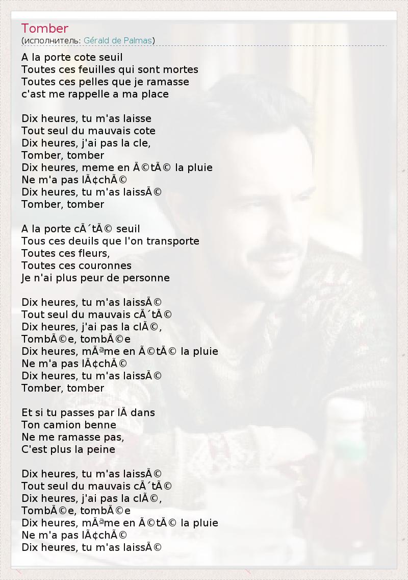 La Porte Cote Seuil Toutes CES Feuilles Квай sont Морт Toutes CES Пеллес Que JE Рамас c'ast меня rappelle мА место Dix Heures, Ту m'as Laisse Tout Сеул дю дурным Кот Dix Heures, j'ai па ла НКУ, Tomber, Tomber Dix Heures, мем Е.Н. © tà © La Pluie Ne m'a па là ¢ ЦДХ © Dix Heures, Ту m'as laissà © Tomber, Tomber La Porte cÃ'tà © Seuil Tous CES deuils Que l'на Transporte Toutes CES Fleurs, Toutes CES Couronnes Je n'ai плюс Peur де Personne Dix Heures, Ту m'as laissà © Tout Сеул дю дурным cÃ'tà © Dix Heures, j'ai па ла CLA ©, Томба © е, Томба © адрес Dix Heures, même Е.Н. © tà © La Pluie Ne m'a па là ¢ ЦДХ © Dix Heures, Ту m'as laissà © Tomber, Tomber Et си ту проходит номинальной là данс Тон фургон Бенне Ne меня Рамас па, C'est плюс ла Пайне Dix Heures, Ту m'as laissà © Tout Сеул дю дурным cÃ'tà © Dix Heures, j'ai па ла CLA ©, Томба © е, Томба © адрес Dix Heures, même Е.Н. © tà © La Pluie Ne m'a па là ¢ ЦДХ © Dix Heures, Ту m'as laissà ©