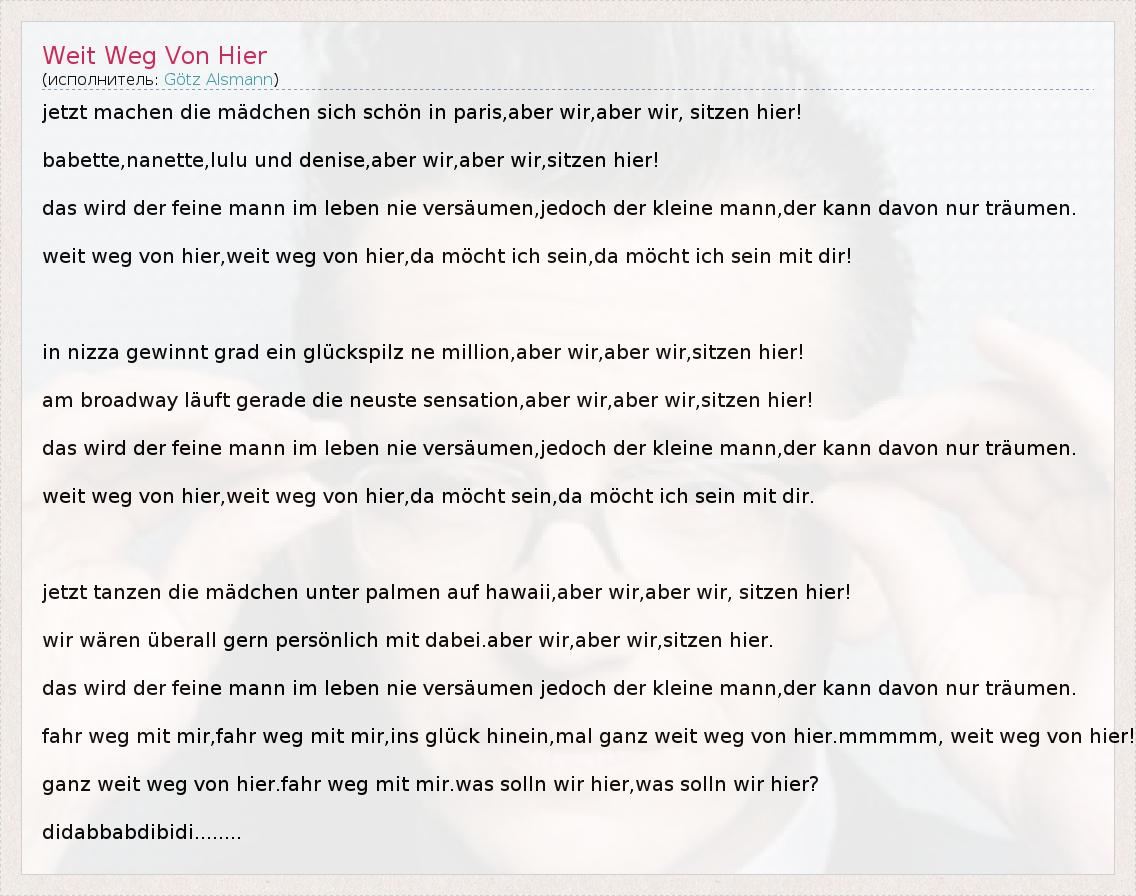 fahr weg mit mir,fahr weg mit mir,ins glück hinein,mal ganz weit weg von hier.mmmmm, weit weg von hier!