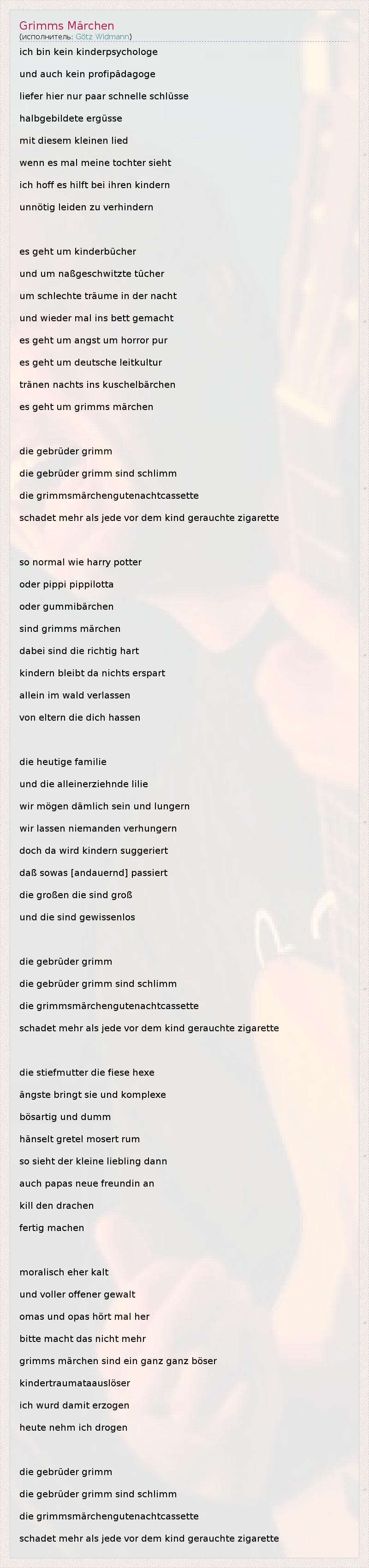 ich bin kein kinderpsychologe und auch kein profipädagoge liefer hier nur paar schnelle schlüsse halbgebildete ergüsse mit diesem kleinen lied wenn es mal meine tochter sieht ich hoff es hilft bei ihren kindern unnötig leiden zu verhindern es geht um kinderbücher und um naßgeschwitzte tücher um schlechte träume in der nacht und wieder mal ins bett gemacht es geht um angst um horror pur es geht um deutsche leitkultur tränen nachts ins kuschelbärchen es geht um grimms märchen die gebrüder grimm die gebrüder grimm sind schlimm die grimmsmärchengutenachtcassette schadet mehr als jede vor dem kind gerauchte zigarette so normal wie harry potter oder pippi pippilotta oder gummibärchen sind grimms märchen dabei sind die richtig hart kindern bleibt da nichts erspart allein im wald verlassen von eltern die dich hassen die heutige familie und die alleinerziehnde lilie wir mögen dämlich sein und lungern wir lassen niemanden verhungern doch da wird kindern suggeriert daß sowas [andauernd] passiert die großen die sind groß und die sind gewissenlos die gebrüder grimm die gebrüder grimm sind schlimm die grimmsmärchengutenachtcassette schadet mehr als jede vor dem kind gerauchte zigarette die stiefmutter die fiese hexe ängste bringt sie und komplexe bösartig und dumm hänselt gretel mosert rum so sieht der kleine liebling dann auch papas neue freundin an kill den drachen fertig machen moralisch eher kalt und voller offener gewalt omas und opas hört mal her bitte macht das nicht mehr grimms märchen sind ein ganz ganz böser kindertraumataauslöser ich wurd damit erzogen heute nehm ich drogen die gebrüder grimm die gebrüder grimm sind schlimm die grimmsmärchengutenachtcassette schadet mehr als jede vor dem kind gerauchte zigarette