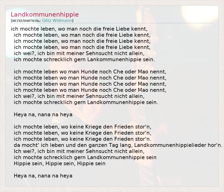 ich mochte leben, wo man noch die freie Liebe kennt, ich mochte leben, wo man noch die freie Liebe kennt, ich mochte leben, wo man noch die freie Liebe kennt, ich mochte leben, wo man noch die freie Liebe kennt, ich wei?, ich bin mit meiner Sehnsucht nicht allein, ich mochte schrecklich gern Lankommunenhippie sein. ich mochte leben wo man Hunde noch Che oder Mao nennt, ich mochte leben wo man Hunde noch Che oder Mao nennt, ich mochte leben wo man Hunde noch Che oder Mao nennt, ich mochte leben wo man Hunde noch Che oder Mao nennt, ich wei?, ich bin mit meiner Sehnsucht nicht allein, ich mochte schrecklich gern Landkommunenhippie sein. Heya na, nana na heya ich mochte leben, wo keine Kriege den Frieden stor'n, ich mochte leben, wo keine Kriege den Frieden stor'n, ich mochte leben, wo keine Kriege den Frieden stor'n. da mocht' ich leben und den ganzen Tag lang, Landkommunenhippielieder hor'n. Ich wei?, ich bin mit meiner Sehnsucht nicht allein, ich mochte schrecklich gern Landkommunenhippie sein Hippie sein, Hippie sein, Hippie sein Heya na, nana na heya