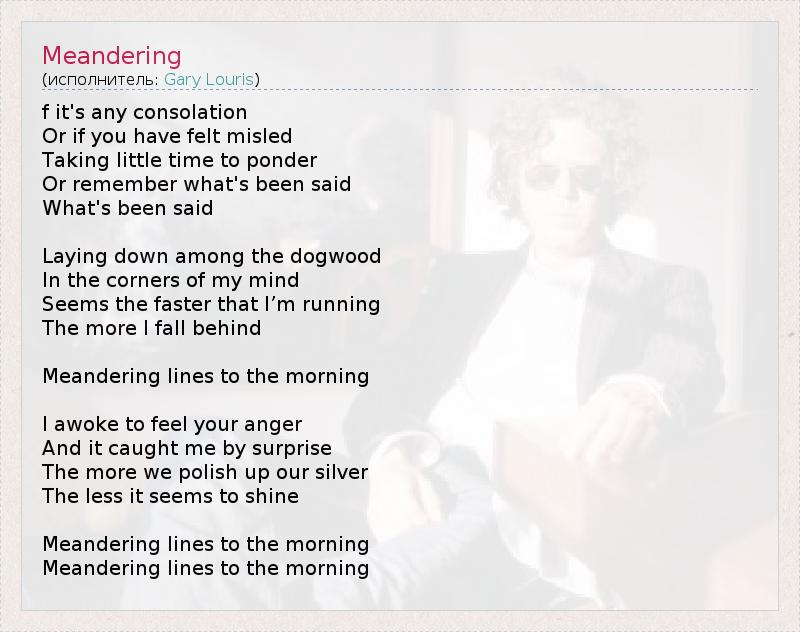 f it's any consolation Or if you have felt misled Taking little time to ponder Or remember what's been said What's been said Laying down among the dogwood In the corners of my mind Seems the faster that I’m running The more I fall behind Meandering lines to the morning I awoke to feel your anger And it caught me by surprise The more we polish up our silver The less it seems to shine Meandering lines to the morning Meandering lines to the morning