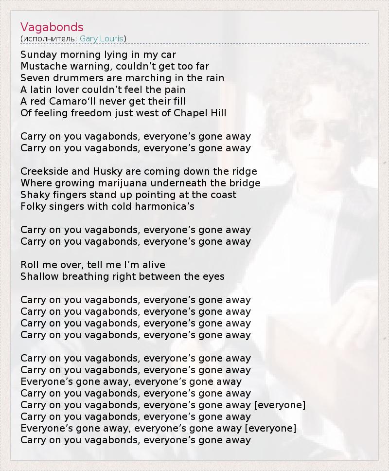 Sunday morning lying in my car Mustache warning, couldn’t get too far Seven drummers are marching in the rain A latin lover couldn’t feel the pain A red Camaro‘ll never get their fill Of feeling freedom just west of Chapel Hill Carry on you vagabonds, everyone’s gone away Carry on you vagabonds, everyone’s gone away Creekside and Husky are coming down the ridge Where growing marijuana underneath the bridge Shaky fingers stand up pointing at the coast Folky singers with cold harmonica’s Carry on you vagabonds, everyone’s gone away Carry on you vagabonds, everyone’s gone away Roll me over, tell me I’m alive Shallow breathing right between the eyes Carry on you vagabonds, everyone’s gone away Carry on you vagabonds, everyone’s gone away Carry on you vagabonds, everyone’s gone away Carry on you vagabonds, everyone’s gone away Carry on you vagabonds, everyone’s gone away Carry on you vagabonds, everyone’s gone away Everyone’s gone away, everyone’s gone away Carry on you vagabonds, everyone’s gone away Carry on you vagabonds, everyone’s gone away [everyone] Carry on you vagabonds, everyone’s gone away Everyone’s gone away, everyone’s gone away [everyone] Carry on you vagabonds, everyone’s gone away