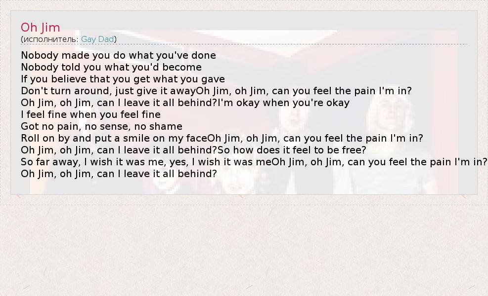 Don't turn around, just give it awayOh Jim, oh Jim, can you feel the pain I'm in?