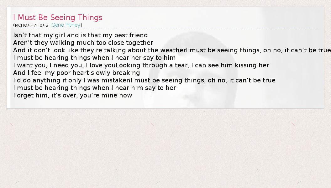 Isn't that my girl and is that my best friend Aren't they walking much too close together And it don't look like they're talking about the weatherI must be seeing things, oh no, it can't be true I must be hearing things when I hear her say to him I want you, I need you, I love youLooking through a tear, I can see him kissing her And I feel my poor heart slowly breaking I'd do anything if only I was mistakenI must be seeing things, oh no, it can't be true I must be hearing things when I hear him say to her Forget him, it's over, you're mine now