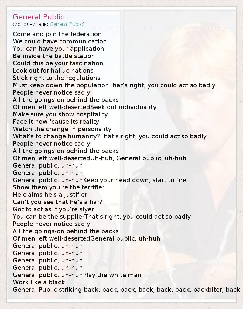 Come and join the federation We could have communication You can have your application Be inside the battle station Could this be your fascination Look out for hallucinations Stick right to the regulations Must keep down the populationThat's right, you could act so badly People never notice sadly All the goings-on behind the backs Of men left well-desertedSeek out individuality Make sure you show hospitality Face it now 'cause its reality Watch the change in personality What's to change humanity?That's right, you could act so badly People never notice sadly All the goings-on behind the backs Of men left well-desertedUh-huh, General public, uh-huh General public, uh-huh General public, uh-huh General public, uh-huhKeep your head down, start to fire Show them you're the terrifier He claims he's a justifier Can't you see that he's a liar? Got to act as if you're slyer You can be the supplierThat's right, you could act so badly People never notice sadly All the goings-on behind the backs Of men left well-desertedGeneral public, uh-huh General public, uh-huh General public, uh-huh General public, uh-huh General public, uh-huh General public, uh-huhPlay the white man Work like a black General Public striking back, back, back, back, back, back, backbiter, back