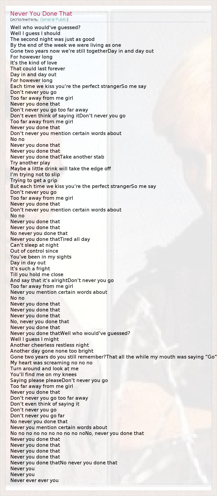 Well who would've guessed? Well I guess I should The second night was just as good By the end of the week we were living as one Gone two years now we're still togetherDay in and day out For however long It's the kind of love That could last forever Day in and day out For however long Each time we kiss you're the perfect strangerSo me say Don't never you go Too far away from me girl Never you done that Don't never you go too far away Don't even think of saying itDon't never you go Too far away from me girl Never you done that Don't never you mention certain words about No no Never you done that Never you done that Never you done thatTake another stab Try another play Maybe a little drink will take the edge off I'm trying not to slip Trying to get a grip But each time we kiss you're the perfect strangerSo me say Don't never you go Too far away from me girl Never you done that Don't never you mention certain words about No no Never you done that Never you done that No never you done that Never you done thatTired all day Can't sleep at night Out of control since You've been in my sights Day in day out It's such a fright Till you hold me close And say that it's alrightDon't never you go Too far away from me girl Never you mention certain words about No no Never you done that Never you done that Never you done that No, never you done that Never you done that Never you done thatWell who would've guessed? Well I guess I might Another cheerless restless night Another day gone none too bright Gone two years do you still remember?That all the while my mouth was saying "Go" My heart was screaming no no no Turn around and look at me You'll find me on my knees Saying please pleaseDon't never you go Too far away from me girl Never you done that Don't never you go too far away Don't even think of saying it Don't never you go Don't never you go far No never you done that Never you mention certain words about No no no no no no no no no noNo, never you done that Never you done that Never you done that Never you done that Never you done that Never you done thatNo never you done that Never you Never you Never ever ever you
