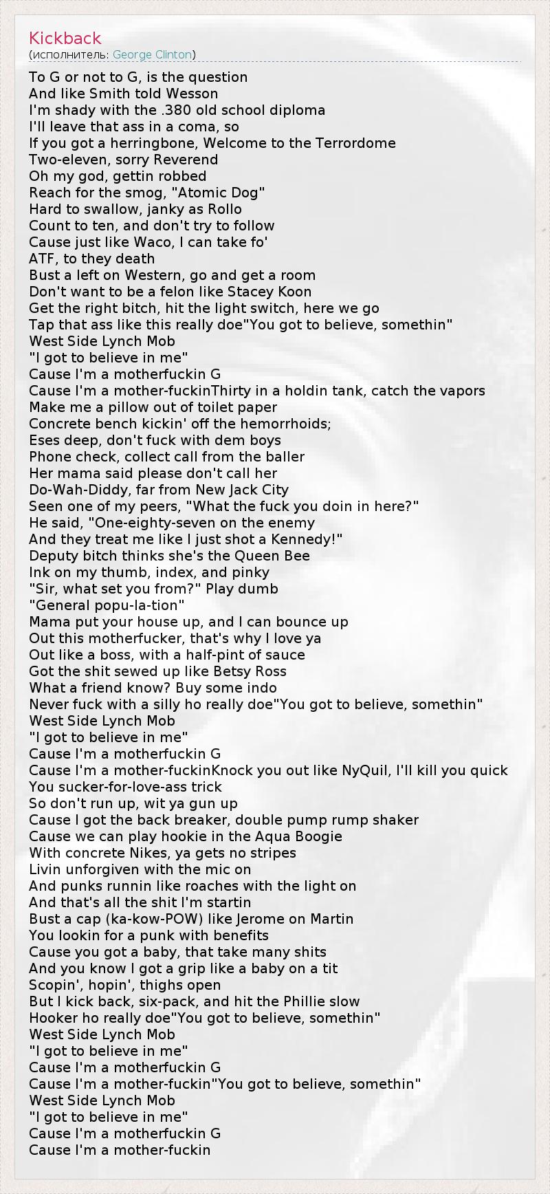 To G or not to G, is the question And like Smith told Wesson I'm shady with the .380 old school diploma I'll leave that ass in a coma, so If you got a herringbone, Welcome to the Terrordome Two-eleven, sorry Reverend Oh my god, gettin robbed Reach for the smog, "Atomic Dog" Hard to swallow, janky as Rollo Count to ten, and don't try to follow Cause just like Waco, I can take fo' ATF, to they death Bust a left on Western, go and get a room Don't want to be a felon like Stacey Koon Get the right bitch, hit the light switch, here we go Tap that ass like this really doe"You got to believe, somethin" West Side Lynch Mob "I got to believe in me" Cause I'm a motherfuckin G Cause I'm a mother-fuckinThirty in a holdin tank, catch the vapors Make me a pillow out of toilet paper Concrete bench kickin' off the hemorrhoids; Eses deep, don't fuck with dem boys Phone check, collect call from the baller Her mama said please don't call her Do-Wah-Diddy, far from New Jack City Seen one of my peers, "What the fuck you doin in here?" He said, "One-eighty-seven on the enemy And they treat me like I just shot a Kennedy!" Deputy bitch thinks she's the Queen Bee Ink on my thumb, index, and pinky "Sir, what set you from?" Play dumb "General popu-la-tion" Mama put your house up, and I can bounce up Out this motherfucker, that's why I love ya Out like a boss, with a half-pint of sauce Got the shit sewed up like Betsy Ross What a friend know? Buy some indo Never fuck with a silly ho really doe"You got to believe, somethin" West Side Lynch Mob "I got to believe in me" Cause I'm a motherfuckin G Cause I'm a mother-fuckinKnock you out like NyQuil, I'll kill you quick You sucker-for-love-ass trick So don't run up, wit ya gun up Cause I got the back breaker, double pump rump shaker Cause we can play hookie in the Aqua Boogie With concrete Nikes, ya gets no stripes Livin unforgiven with the mic on And punks runnin like roaches with the light on And that's all the shit I'm startin Bust a cap (ka-kow-POW) like Jerome on Martin You lookin for a punk with benefits Cause you got a baby, that take many shits And you know I got a grip like a baby on a tit Scopin', hopin', thighs open But I kick back, six-pack, and hit the Phillie slow Hooker ho really doe"You got to believe, somethin" West Side Lynch Mob "I got to believe in me" Cause I'm a motherfuckin G Cause I'm a mother-fuckin"You got to believe, somethin" West Side Lynch Mob "I got to believe in me" Cause I'm a motherfuckin G Cause I'm a mother-fuckin
