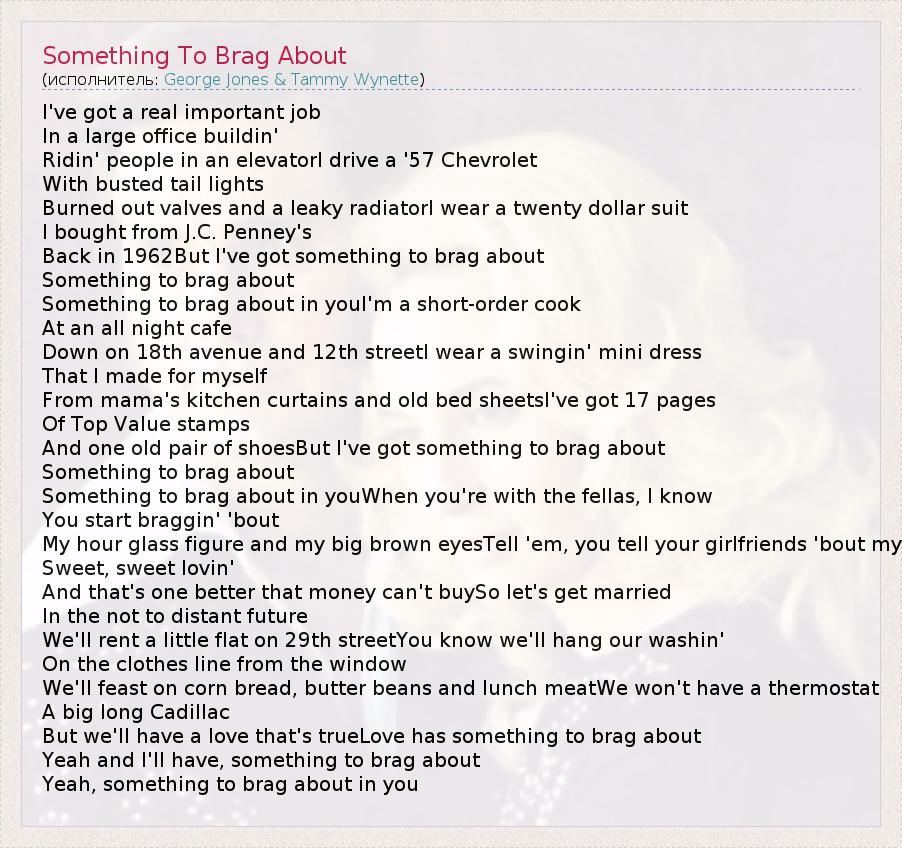I've got a real important job In a large office buildin' Ridin' people in an elevatorI drive a '57 Chevrolet With busted tail lights Burned out valves and a leaky radiatorI wear a twenty dollar suit I bought from J.C. Penney's Back in 1962But I've got something to brag about Something to brag about Something to brag about in youI'm a short-order cook At an all night cafe Down on 18th avenue and 12th streetI wear a swingin' mini dress That I made for myself From mama's kitchen curtains and old bed sheetsI've got 17 pages Of Top Value stamps And one old pair of shoesBut I've got something to brag about Something to brag about Something to brag about in youWhen you're with the fellas, I know You start braggin' 'bout My hour glass figure and my big brown eyesTell 'em, you tell your girlfriends 'bout my Sweet, sweet lovin' And that's one better that money can't buySo let's get married In the not to distant future We'll rent a little flat on 29th streetYou know we'll hang our washin' On the clothes line from the window We'll feast on corn bread, butter beans and lunch meatWe won't have a thermostat A big long Cadillac But we'll have a love that's trueLove has something to brag about Yeah and I'll have, something to brag about Yeah, something to brag about in you
