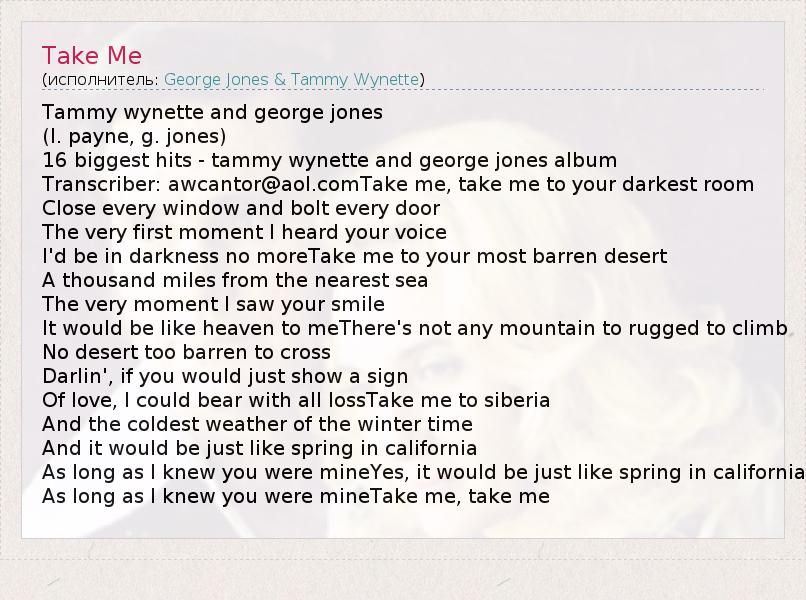 Tammy wynette and george jones (l. payne, g. jones) 16 biggest hits - tammy wynette and george jones album Transcriber: awcantor@aol.comTake me, take me to your darkest room Close every window and bolt every door The very first moment I heard your voice I'd be in darkness no moreTake me to your most barren desert A thousand miles from the nearest sea The very moment I saw your smile It would be like heaven to meThere's not any mountain to rugged to climb No desert too barren to cross Darlin', if you would just show a sign Of love, I could bear with all lossTake me to siberia And the coldest weather of the winter time And it would be just like spring in california As long as I knew you were mineYes, it would be just like spring in california As long as I knew you were mineTake me, take me