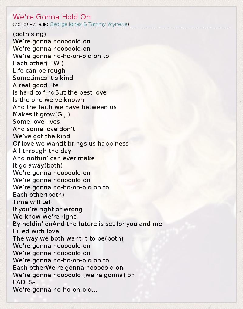 (both sing) We're gonna hooooold on We're gonna hooooold on We're gonna ho-ho-oh-old on to Each other(T.W.) Life can be rough Sometimes it's kind A real good life Is hard to findBut the best love Is the one we've known And the faith we have between us Makes it grow(G.J.) Some love lives And some love don't We've got the kind Of love we wantIt brings us happiness All through the day And nothin' can ever make It go away(both) We're gonna hooooold on We're gonna hooooold on We're gonna ho-ho-oh-old on to Each other(both) Time will tell If you're right or wrong We know we're right By holdin' onAnd the future is set for you and me Filled with love The way we both want it to be(both) We're gonna hooooold on We're gonna hooooold on We're gonna ho-ho-oh-old on to Each otherWe're gonna hooooold on We're gonna hooooold (we're gonna) on FADES- We're gonna ho-ho-oh-old...
