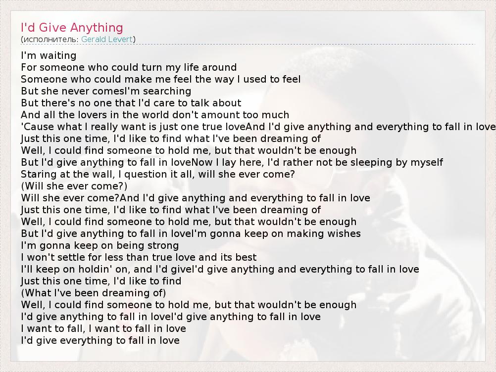 I'm waiting For someone who could turn my life around Someone who could make me feel the way I used to feel But she never comesI'm searching But there's no one that I'd care to talk about And all the lovers in the world don't amount too much 'Cause what I really want is just one true loveAnd I'd give anything and everything to fall in love Just this one time, I'd like to find what I've been dreaming of Well, I could find someone to hold me, but that wouldn't be enough But I'd give anything to fall in loveNow I lay here, I'd rather not be sleeping by myself Staring at the wall, I question it all, will she ever come? (Will she ever come?) Will she ever come?And I'd give anything and everything to fall in love Just this one time, I'd like to find what I've been dreaming of Well, I could find someone to hold me, but that wouldn't be enough But I'd give anything to fall in loveI'm gonna keep on making wishes I'm gonna keep on being strong I won't settle for less than true love and its best I'll keep on holdin' on, and I'd giveI'd give anything and everything to fall in love Just this one time, I'd like to find (What I've been dreaming of) Well, I could find someone to hold me, but that wouldn't be enough I'd give anything to fall in loveI'd give anything to fall in love I want to fall, I want to fall in love I'd give everything to fall in love
