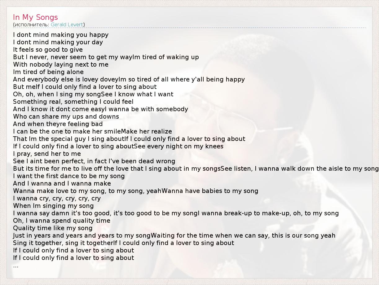 I dont mind making you happy I dont mind making your day It feels so good to give But I never, never seem to get my wayIm tired of waking up With nobody laying next to me Im tired of being alone And everybody else is lovey doveyIm so tired of all where y'all being happy But meIf I could only find a lover to sing about Oh, oh, when I sing my songSee I know what I want Something real, something I could feel And I know it dont come easyI wanna be with somebody Who can share my ups and downs And when theyre feeling bad I can be the one to make her smileMake her realize That Im the special guy I sing aboutIf I could only find a lover to sing about If I could only find a lover to sing aboutSee every night on my knees I pray, send her to me See I aint been perfect, in fact I've been dead wrong But its time for me to live off the love that I sing about in my songsSee listen, I wanna walk down the aisle to my song I want the first dance to be my song And I wanna and I wanna make Wanna make love to my song, to my song, yeahWanna have babies to my song I wanna cry, cry, cry, cry, cry When Im singing my song I wanna say damn it's too good, it's too good to be my songI wanna break-up to make-up, oh, to my song Oh, I wanna spend quality time Quality time like my song Just in years and years and years to my songWaiting for the time when we can say, this is our song yeah Sing it together, sing it togetherIf I could only find a lover to sing about If I could only find a lover to sing about If I could only find a lover to sing about ...