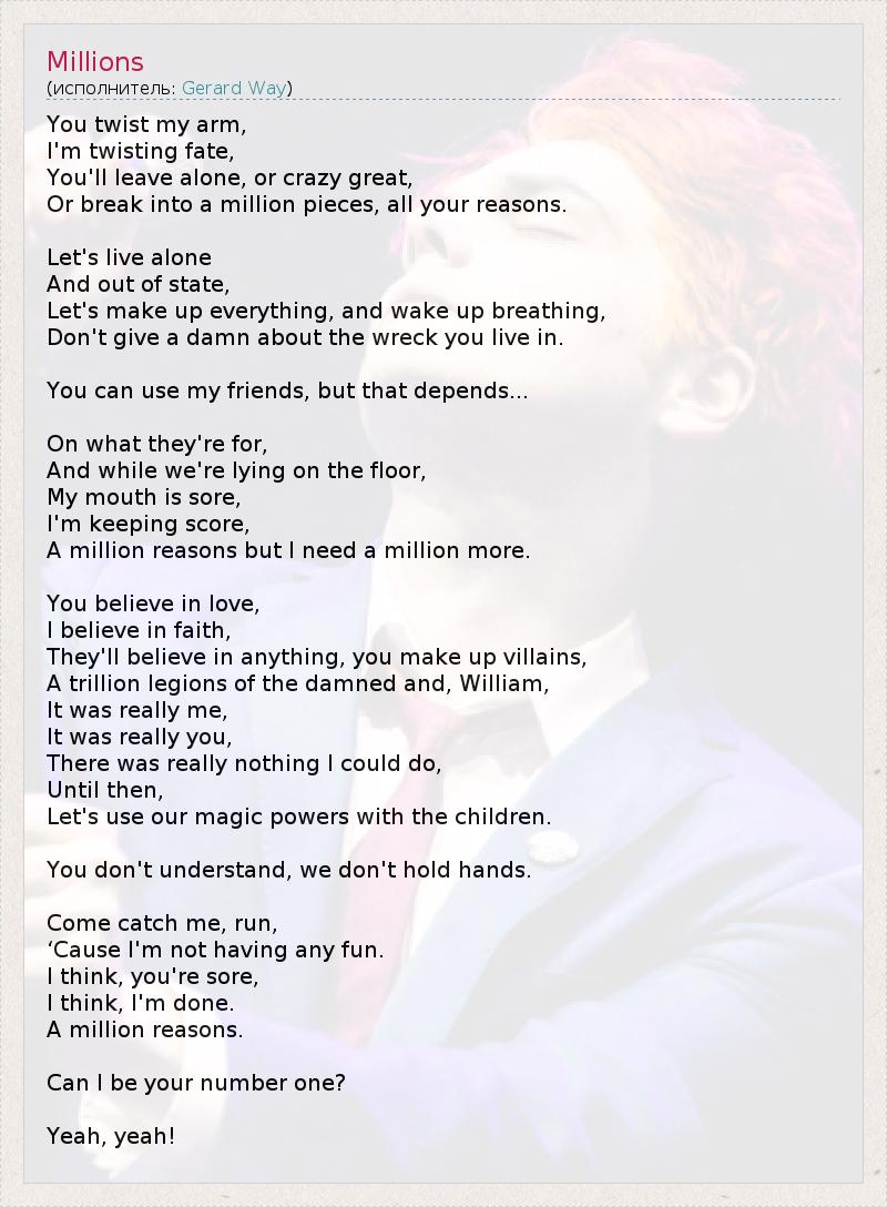 Ты выкручиваешь мне руку, А я поворачиваю ход судьбы. Ты останешься в одиночестве, или тебе будет безумно хорошо, Или все твои причины разлетятся на миллион осколков. Давай жить одни И не здесь, Давай исправим всё, и будем просыпаться, вздыхая, Наплевать на разруху, что осталась после тебя. Ты можешь воспользоваться моими друзьями, но это зависит от того... Для чего они нужны. И пока мы лежим на полу, У меня ноют губы: Я веду счёт. Нашёлся миллион причин, но мне нужно ещё столько же. Ты веришь в любовь, Я верю в верность, Другие поверят во что угодно, ты выдумываешь злодеев, Триллион легионов проклятых, и, Уильям, 1 Это, и в самом деле, был я, Это, и в самом деле, был ты, Я ничего не мог сделать, А до тех пор Давай, используем наши магические силы с детьми. Ты не понимаешь, мы не держимся за руки. Ну же, поймай меня, беги, Потому что мне вообще не весело. Думаю, ты больна, Думаю, я закончил. Миллион причин. Можно я буду номером "один" для тебя? Да, да! 1 — Вероятно, отсылка к синглу 1984 года группы The Smiths "William, It Was Really Nothing".