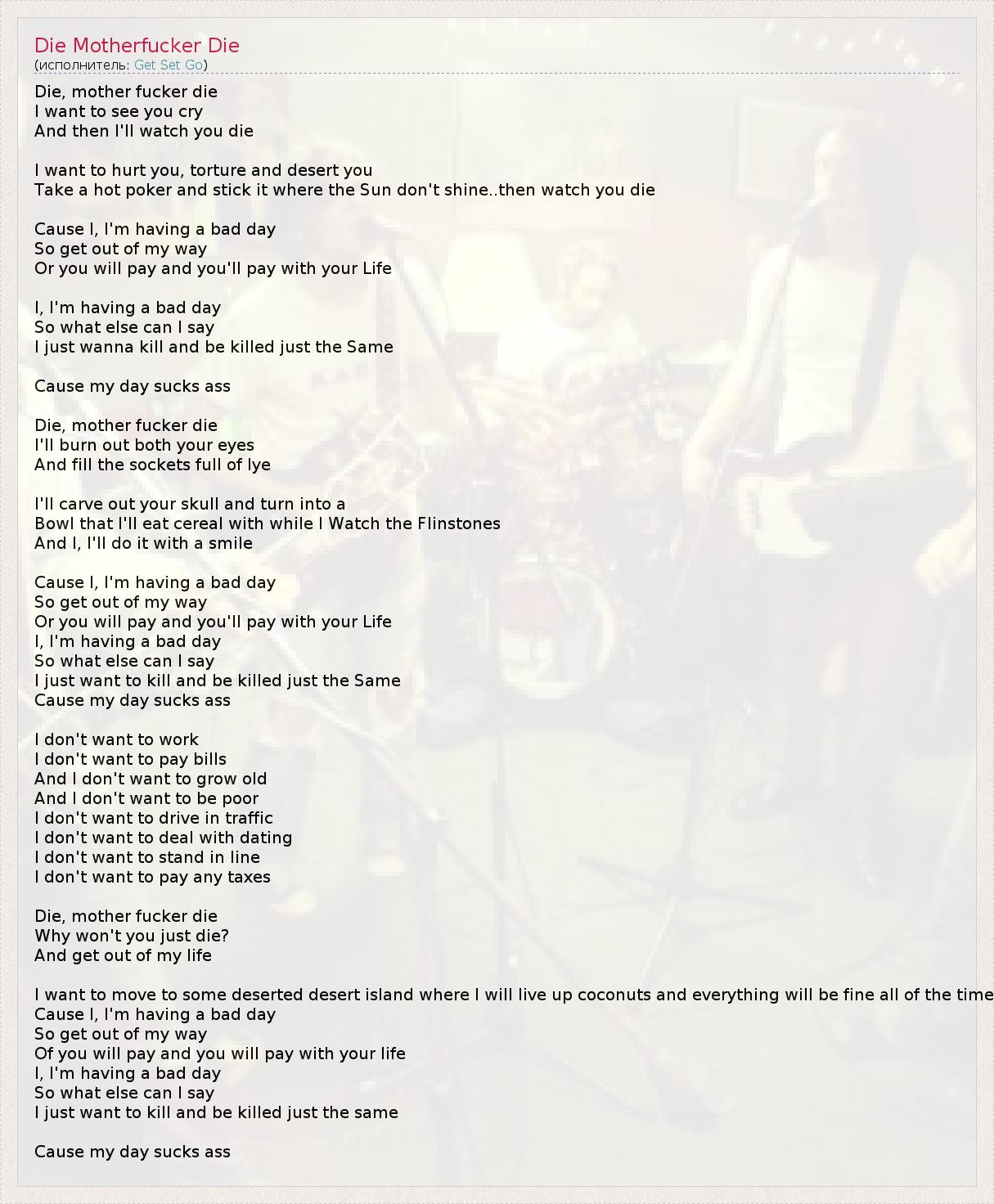 Die, mother fucker die I want to see you cry And then I'll watch you die I want to hurt you, torture and desert you Take a hot poker and stick it where the Sun don't shine..then watch you die Cause I, I'm having a bad day So get out of my way Or you will pay and you'll pay with your Life I, I'm having a bad day So what else can I say I just wanna kill and be killed just the Same Cause my day sucks ass Die, mother fucker die I'll burn out both your eyes And fill the sockets full of lye I'll carve out your skull and turn into a Bowl that I'll eat cereal with while I Watch the Flinstones And I, I'll do it with a smile Cause I, I'm having a bad day So get out of my way Or you will pay and you'll pay with your Life I, I'm having a bad day So what else can I say I just want to kill and be killed just the Same Cause my day sucks ass I don't want to work I don't want to pay bills And I don't want to grow old And I don't want to be poor I don't want to drive in traffic I don't want to deal with dating I don't want to stand in line I don't want to pay any taxes Die, mother fucker die Why won't you just die? And get out of my life I want to move to some deserted desert island where I will live up coconuts and everything will be fine all of the time Cause I, I'm having a bad day So get out of my way Of you will pay and you will pay with your life I, I'm having a bad day So what else can I say I just want to kill and be killed just the same Cause my day sucks ass
