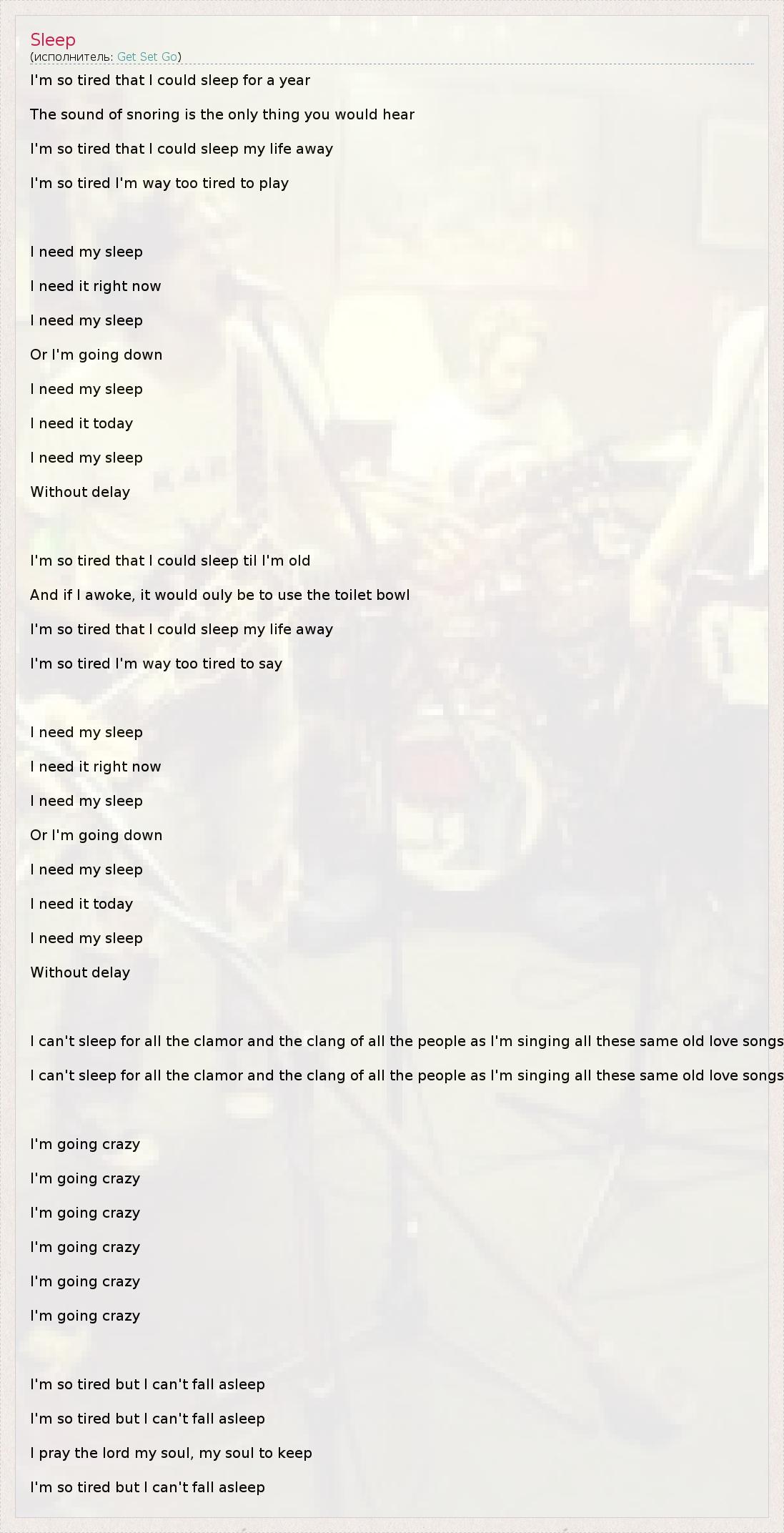 I'm so tired that I could sleep for a year The sound of snoring is the only thing you would hear I'm so tired that I could sleep my life away I'm so tired I'm way too tired to play I need my sleep I need it right now I need my sleep Or I'm going down I need my sleep I need it today I need my sleep Without delay I'm so tired that I could sleep til I'm old And if I awoke, it would ouly be to use the toilet bowl I'm so tired that I could sleep my life away I'm so tired I'm way too tired to say I need my sleep I need it right now I need my sleep Or I'm going down I need my sleep I need it today I need my sleep Without delay I can't sleep for all the clamor and the clang of all the people as I'm singing all these same old love songs I can't sleep for all the clamor and the clang of all the people as I'm singing all these same old love songs I'm going crazy I'm going crazy I'm going crazy I'm going crazy I'm going crazy I'm going crazy I'm so tired but I can't fall asleep I'm so tired but I can't fall asleep I pray the lord my soul, my soul to keep I'm so tired but I can't fall asleep