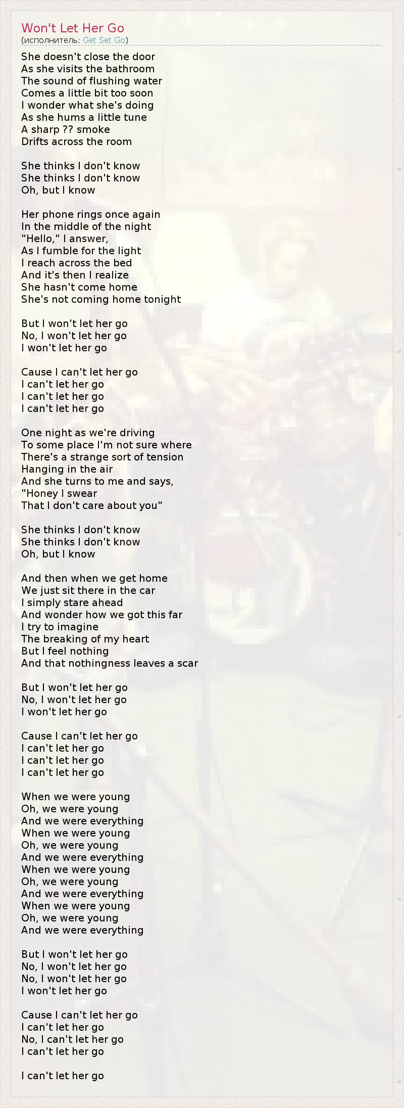 She doesn't close the door As she visits the bathroom The sound of flushing water Comes a little bit too soon I wonder what she's doing As she hums a little tune A sharp ?? smoke Drifts across the room She thinks I don't know She thinks I don't know Oh, but I know Her phone rings once again In the middle of the night "Hello," I answer, As I fumble for the light I reach across the bed And it's then I realize She hasn't come home She's not coming home tonight But I won't let her go No, I won't let her go I won't let her go Cause I can't let her go I can't let her go I can't let her go I can't let her go One night as we're driving To some place I'm not sure where There's a strange sort of tension Hanging in the air And she turns to me and says, "Honey I swear That I don't care about you" She thinks I don't know She thinks I don't know Oh, but I know And then when we get home We just sit there in the car I simply stare ahead And wonder how we got this far I try to imagine The breaking of my heart But I feel nothing And that nothingness leaves a scar But I won't let her go No, I won't let her go I won't let her go Cause I can't let her go I can't let her go I can't let her go I can't let her go When we were young Oh, we were young And we were everything When we were young Oh, we were young And we were everything When we were young Oh, we were young And we were everything When we were young Oh, we were young And we were everything But I won't let her go No, I won't let her go No, I won't let her go I won't let her go Cause I can't let her go I can't let her go No, I can't let her go I can't let her go I can't let her go