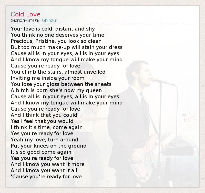 Your love is cold, distant and shy You think no one deserves your time Precious, Pristine, you look so clean But too much make-up will stain your dress Cause all is in your eyes, all is in your eyes And I know my tongue will make your mind Cause you're ready for love You climb the stairs, almost unveiled Inviting me inside your room You lose your gloss between the sheets A bitch is born she's now my queen Cause all is in your eyes, all is in your eyes And I know my tongue will make your mind Cause you're ready for love And I think that you could Yes I feel that you would I think it's time, come again Yes you're ready for love Yeah my love, turn around Put your knees on the ground It's so good come again Yes you're ready for love And I know you want it more And I know you want it all 'Cause you're ready for love