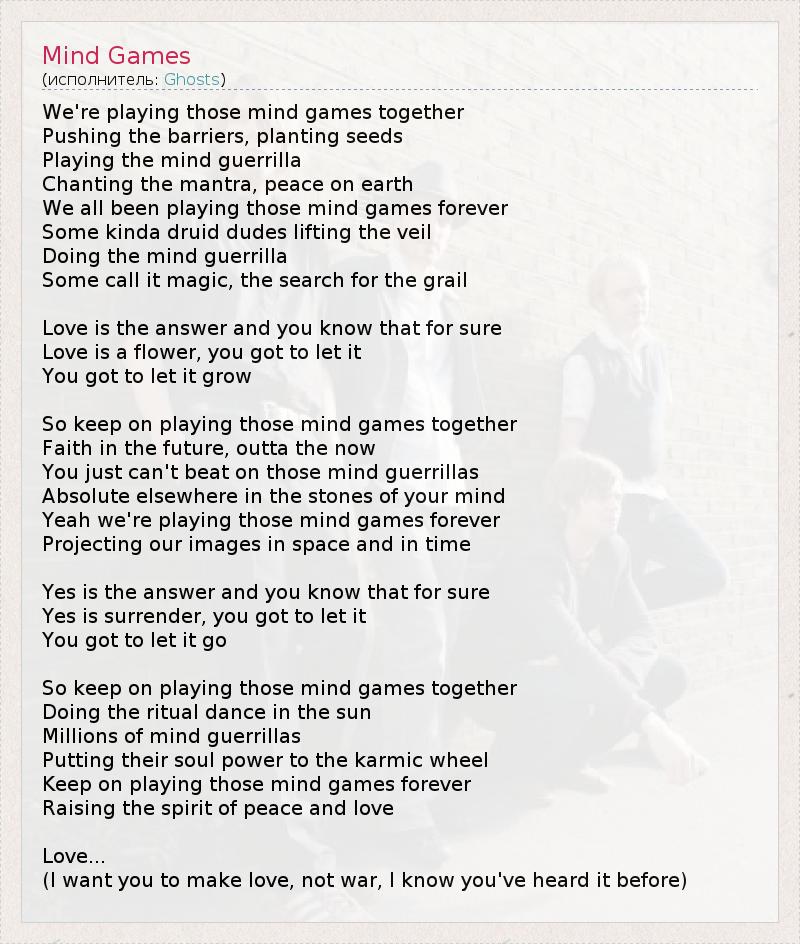 We're playing those mind games together Pushing the barriers, planting seeds Playing the mind guerrilla Chanting the mantra, peace on earth We all been playing those mind games forever Some kinda druid dudes lifting the veil Doing the mind guerrilla Some call it magic, the search for the grail Love is the answer and you know that for sure Love is a flower, you got to let it You got to let it grow So keep on playing those mind games together Faith in the future, outta the now You just can't beat on those mind guerrillas Absolute elsewhere in the stones of your mind Yeah we're playing those mind games forever Projecting our images in space and in time Yes is the answer and you know that for sure Yes is surrender, you got to let it You got to let it go So keep on playing those mind games together Doing the ritual dance in the sun Millions of mind guerrillas Putting their soul power to the karmic wheel Keep on playing those mind games forever Raising the spirit of peace and love Love... (I want you to make love, not war, I know you've heard it before)