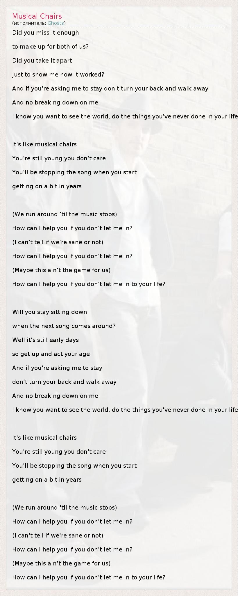 Did you miss it enough to make up for both of us? Did you take it apart just to show me how it worked? And if you're asking me to stay don't turn your back and walk away And no breaking down on me I know you want to see the world, do the things you've never done in your life It's like musical chairs You're still young you don't care You'll be stopping the song when you start getting on a bit in years (We run around 'til the music stops) How can I help you if you don't let me in? (I can't tell if we're sane or not) How can I help you if you don't let me in? (Maybe this ain't the game for us) How can I help you if you don't let me in to your life? Will you stay sitting down when the next song comes around? Well it's still early days so get up and act your age And if you're asking me to stay don't turn your back and walk away And no breaking down on me I know you want to see the world, do the things you've never done in your life It's like musical chairs You're still young you don't care You'll be stopping the song when you start getting on a bit in years (We run around 'til the music stops) How can I help you if you don't let me in? (I can't tell if we're sane or not) How can I help you if you don't let me in? (Maybe this ain't the game for us) How can I help you if you don't let me in to your life?