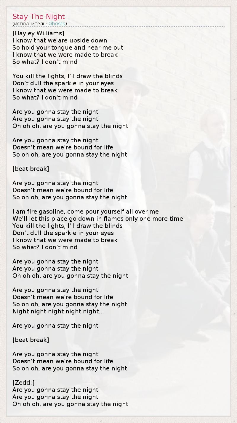 [Hayley Williams:] Я знаю, что все у нас вверх тормашками, Значит, придержи язык и выслушай меня. Я знаю, что нам пришлось расстаться, Ну и что? Я не возражаю. Ты гасишь свет, я опущу жалюзи, Но блеск в твоих глазах от этого не меркнет... Я знаю, что нам пришлось расстаться, Ну и что? Я не возражаю. Ты собираешься остаться на ночь? Ты собираешься остаться на ночь? О-о-о, ты собираешься остаться на ночь? Ты собираешься остаться на ночь? Это не значит, что мы связаны на всю жизнь. Так, о-о-о, ты собираешься остаться на ночь? [проигрыш] Ты собираешься остаться на ночь? Это не значит, что мы связаны на всю жизнь. Так, о-о-о, ты собираешься остаться на ночь? Я – зажигательная смесь, приди заправиться мной, И пусть это место охватит пламя еще только раз. Ты гасишь свет, я опущу жалюзи, Но блеск в твоих глазах от этого не меркнет... Я знаю, что нам пришлось расстаться, Ну и что? Я не возражаю. Ты собираешься остаться на ночь? Ты собираешься остаться на ночь? О-о-о, ты собираешься остаться на ночь? Ты собираешься остаться на ночь? Это не значит, что мы связаны на всю жизнь. Так, о-о-о, ты собираешься остаться на ночь? Ночь ночь ночь ночь ночь... Ты собираешься остаться на ночь? [проигрыш] Ты собираешься остаться на ночь? Это не значит, что мы связаны на всю жизнь. Так, о-о-о, ты собираешься остаться на ночь? [Zedd:] Ты собираешься остаться на ночь? Ты собираешься остаться на ночь? О-о-о, ты собираешься остаться на ночь?