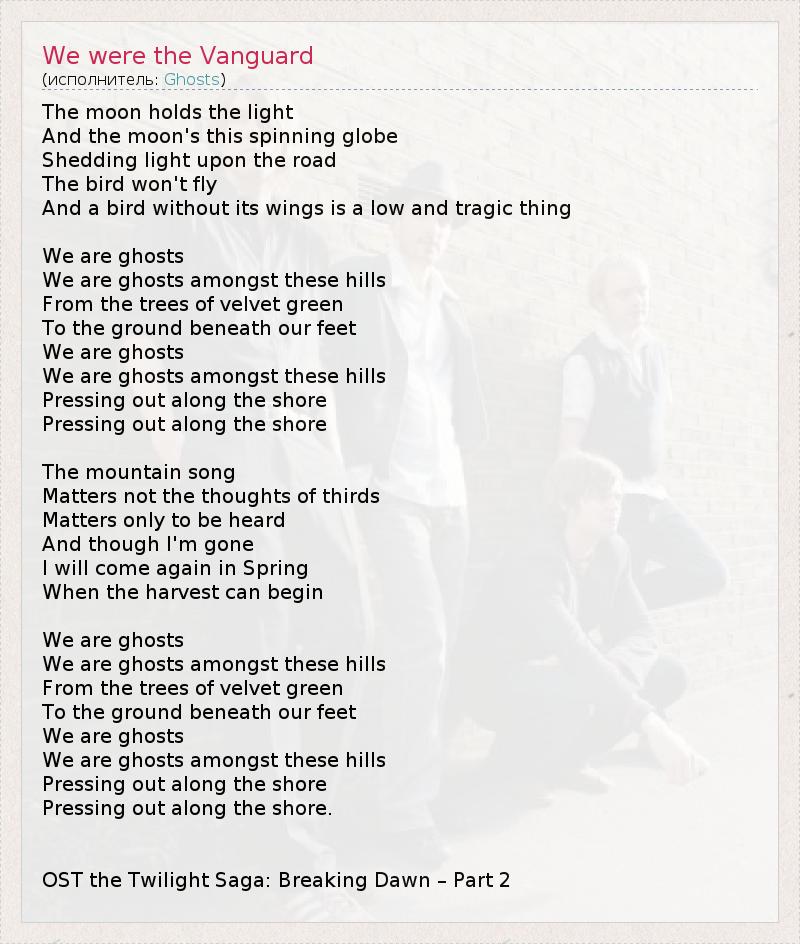 The moon holds the light And the moon's this spinning globe Shedding light upon the road The bird won't fly And a bird without its wings is a low and tragic thing We are ghosts We are ghosts amongst these hills From the trees of velvet green To the ground beneath our feet We are ghosts We are ghosts amongst these hills Pressing out along the shore Pressing out along the shore The mountain song Matters not the thoughts of thirds Matters only to be heard And though I'm gone I will come again in Spring When the harvest can begin We are ghosts We are ghosts amongst these hills From the trees of velvet green To the ground beneath our feet We are ghosts We are ghosts amongst these hills Pressing out along the shore Pressing out along the shore. OST the Twilight Saga: Breaking Dawn – Part 2