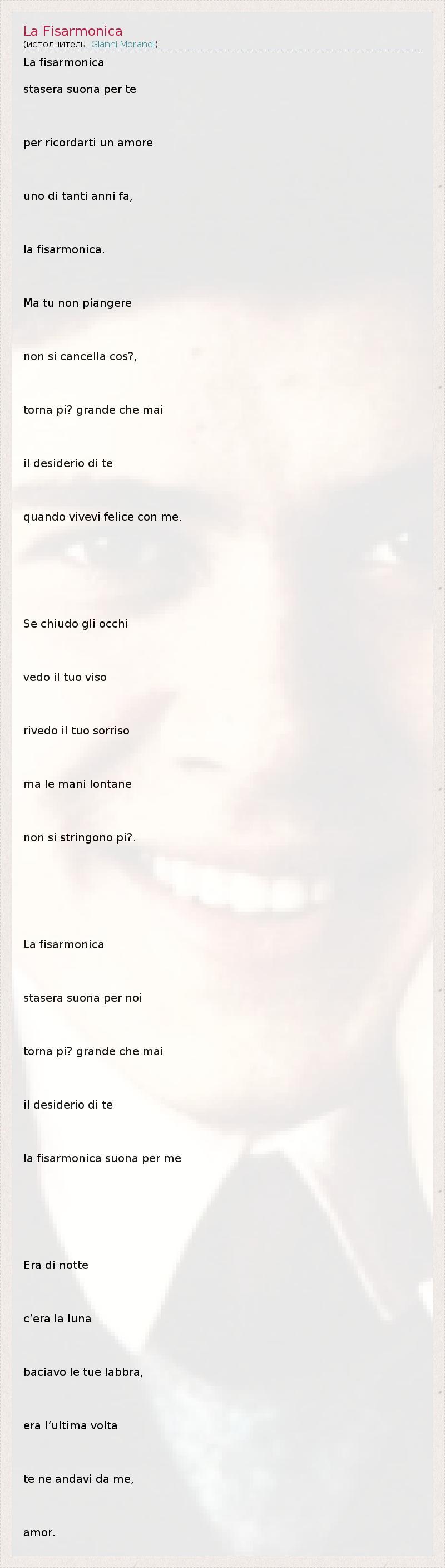 La fisarmonica stasera suona per te per ricordarti un amore uno di tanti anni fa, la fisarmonica. Ma tu non piangere non si cancella cos?, torna pi? grande che mai il desiderio di te quando vivevi felice con me. Se chiudo gli occhi vedo il tuo viso rivedo il tuo sorriso ma le mani lontane non si stringono pi?. La fisarmonica stasera suona per noi torna pi? grande che mai il desiderio di te la fisarmonica suona per me Era di notte c’era la luna baciavo le tue labbra, era l’ultima volta te ne andavi da me, amor.