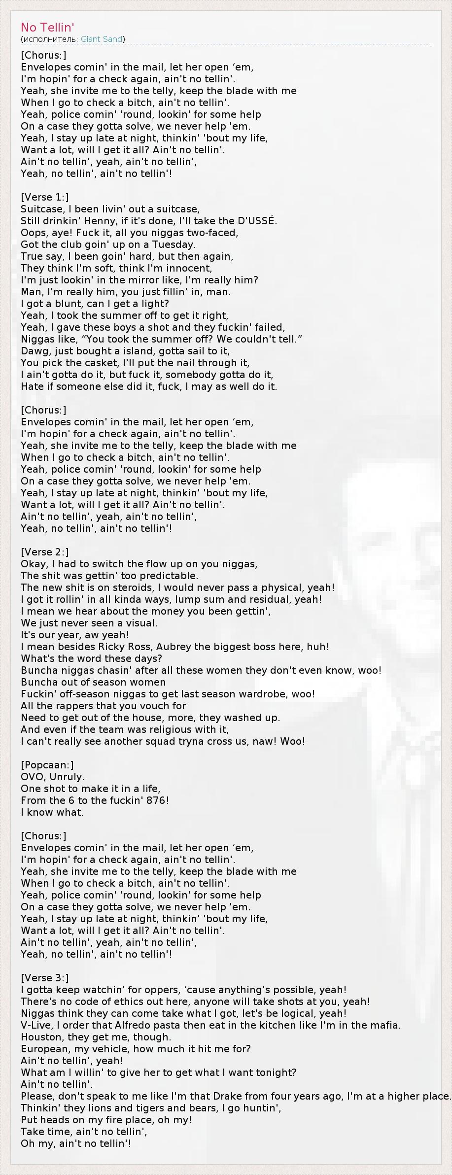 [Припев:] По почте приходят конверты, я разрешаю ей вскрыть их, Я снова надеюсь на чек, но ни слова. Да, она приглашает меня в отель, я возьму с собой нож, Когда пойду навестить су**у, но ни слова. Да, по району ездит полиция, ищет помощи В расследовании дела, но мы никогда не помогаем им. Да, я не сплю допоздна, размышляю о своей жизни, Хочу многого, получу ли я всё? Ни слова. Ни слова, да, ни слова, Да, ни слова, ни словечка. [Куплет 1:] Чемоданы, я живу на чемоданах, Продолжаю пить "Хенни", а когда он кончится, закажу D'USSE. 1 Опа! Эге! Ну на х**, все вы, ниггеры, двуличные, Я разорвал клуб во вторник. Точняк, я выжимал из себя всё, но, с другой стороны, Меня считают мягким, меня читают невинным. Я просто смотрюсь в зеркало: "Это, правда, я?" Чувак, это, правда, я, а ты просто вписался, чувак. У меня есть косяк, огоньку не найдётся? Да, я не работал летом, чтобы привести дела в порядок, Да, я дал этим парням шанс, а они его про**али, Ниггеры удивяются: "Ты отдыхал всё лето? Мы и не заметили!" Братуха, я только что прикупил остров, надо сходить туда под парусом. Ты выбираешь гроб, а я забью гвоздь в его крышку, Мне не обязательно делать это, но, б**, кто-то же должен! Бесит, если это сделал кто-то другой, по х**, я так и поступлю. [Припев:] По почте приходят конверты, я разрешаю ей вскрыть их, Я снова надеюсь на чек, но ни слова. Да, она приглашает меня в отель, я возьму с собой нож, Когда пойду навестить су**у, но ни слова. Да, по району ездит полиция, ищет помощи В расследовании дела, но мы никогда не помогаем им. Да, я не сплю допоздна, размышляю о своей жизни, Хочу многого, получу ли я всё? Ни слова. Ни слова, да, ни слова, Да, ни слова, ни словечка. [Куплет 2:] Ладно, мне пришлось прокачать речитатив для вас, ниггер, А то эта х**нь становилась слишком предсказуемой. Новая музыка — на стероидах, я бы не прошёл тест на допинг, ага! Я поднимаю все бабки — и круглые суммы, и остатки, ага! Я к тому, что мы слыхали про твои заработки, Но что-то не видели их. Это наш год, о да! Если не считать Рики Росса, то Обри здесь самый большой босс, ха! 2 Какие нынче ходят слухи? Куча ниггеров гоняются за бабами, которых даже не знают, ву-у! Куча потасканных женщин Тра**ются с ниггерами не у дел, чтобы одеться по последней моде, ву-у! Всем рэперам, за которых вы ручаетесь, Пора уходить с тусы, они умылись. И даже если бы наша команда была религиозной, Я не вижу тех, кто смог бы скрестить с нами клинки, не-а, ву-у! [Popcaan:] OVO, Анрули. 3 Один шанс преуспеть в жизни, Из 6 до, мать её, 876! 4 Я знаю что. [Припев:] По почте приходят конверты, я разрешаю ей вскрыть их, Я снова надеюсь на чек, но ни слова. Да, она приглашает меня в отель, я возьму с собой нож, Когда пойду навестить су**у, но ни слова. Да, по району ездит полиция, ищет помощи В расследовании дела, но мы никогда не помогаем им. Да, я не сплю допоздна, размышляю о своей жизни, Хочу многого, получу ли я всё? Ни слова. Ни слова, да, ни слова, Да, ни слова, ни словечка. [Куплет 3:] Я слежу за шансами, потому что возможно всё, да! Здесь нет морального кодекса, кто угодно будет гнать на тебя, да! Ниггеры думают, что могут прийти и всё у меня отобрать, но давайте мыслить логично, да! "Ви-Лайв", я заказываю пасту "Альфредо" и ем её на кухне, будто состою в мафии. 5 Хьюстон, там меня понимают. Европейская — это моя тачка. Во сколько она мне влетела? Ни слова, ага! Что я собираюсь ей дать, чтобы получить от неё, что хочу? Ни слова. Пожалуйс