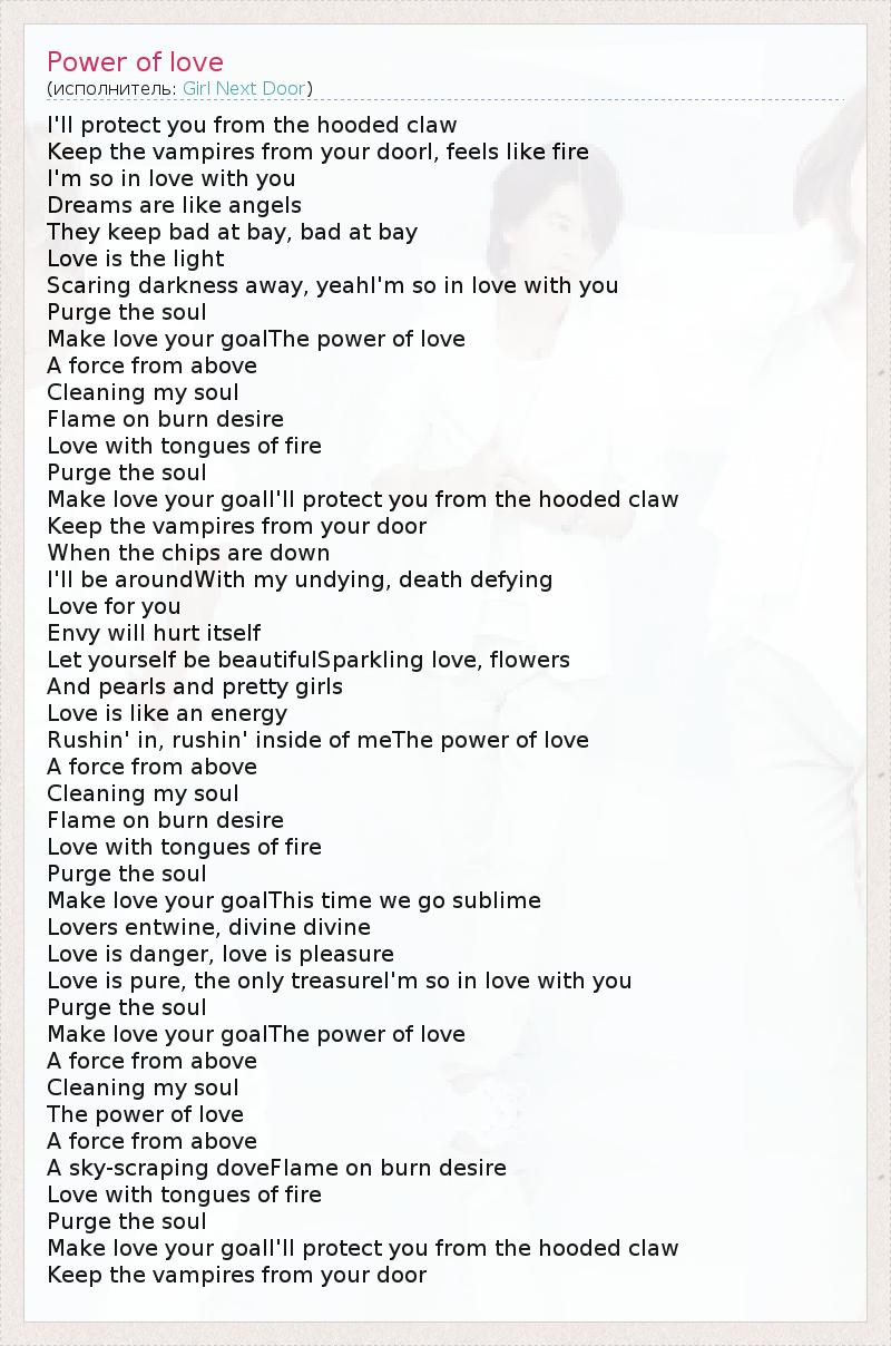 I'll protect you from the hooded claw Keep the vampires from your doorI, feels like fire I'm so in love with you Dreams are like angels They keep bad at bay, bad at bay Love is the light Scaring darkness away, yeahI'm so in love with you Purge the soul Make love your goalThe power of love A force from above Cleaning my soul Flame on burn desire Love with tongues of fire Purge the soul Make love your goalI'll protect you from the hooded claw Keep the vampires from your door When the chips are down I'll be aroundWith my undying, death defying Love for you Envy will hurt itself Let yourself be beautifulSparkling love, flowers And pearls and pretty girls Love is like an energy Rushin' in, rushin' inside of meThe power of love A force from above Cleaning my soul Flame on burn desire Love with tongues of fire Purge the soul Make love your goalThis time we go sublime Lovers entwine, divine divine Love is danger, love is pleasure Love is pure, the only treasureI'm so in love with you Purge the soul Make love your goalThe power of love A force from above Cleaning my soul The power of love A force from above A sky-scraping doveFlame on burn desire Love with tongues of fire Purge the soul Make love your goalI'll protect you from the hooded claw Keep the vampires from your door