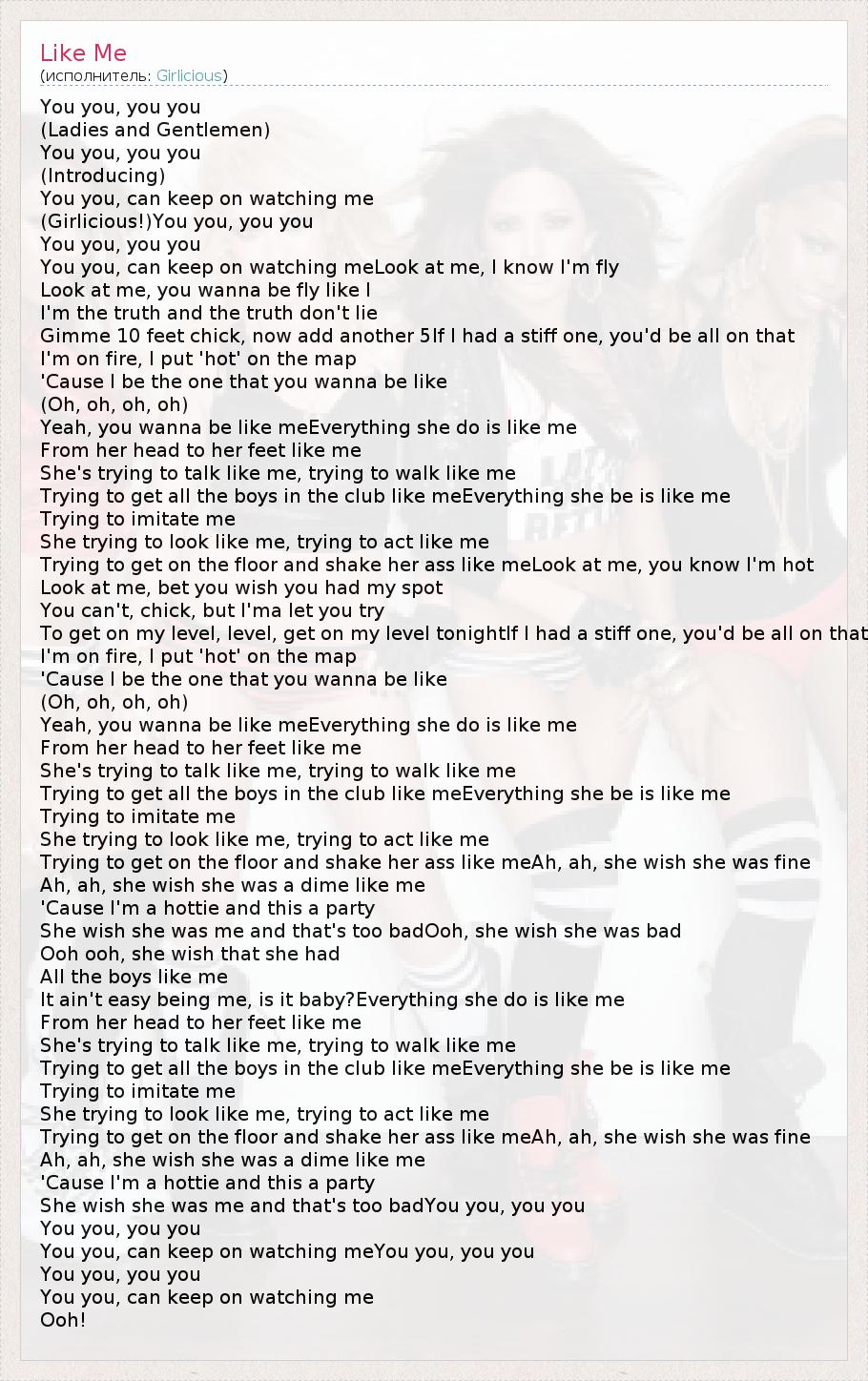 You you, you you (Ladies and Gentlemen) You you, you you (Introducing) You you, can keep on watching me (Girlicious!)You you, you you You you, you you You you, can keep on watching meLook at me, I know I'm fly Look at me, you wanna be fly like I I'm the truth and the truth don't lie Gimme 10 feet chick, now add another 5If I had a stiff one, you'd be all on that I'm on fire, I put 'hot' on the map 'Cause I be the one that you wanna be like (Oh, oh, oh, oh) Yeah, you wanna be like meEverything she do is like me From her head to her feet like me She's trying to talk like me, trying to walk like me Trying to get all the boys in the club like meEverything she be is like me Trying to imitate me She trying to look like me, trying to act like me Trying to get on the floor and shake her ass like meLook at me, you know I'm hot Look at me, bet you wish you had my spot You can't, chick, but I'ma let you try To get on my level, level, get on my level tonightIf I had a stiff one, you'd be all on that I'm on fire, I put 'hot' on the map 'Cause I be the one that you wanna be like (Oh, oh, oh, oh) Yeah, you wanna be like meEverything she do is like me From her head to her feet like me She's trying to talk like me, trying to walk like me Trying to get all the boys in the club like meEverything she be is like me Trying to imitate me She trying to look like me, trying to act like me Trying to get on the floor and shake her ass like meAh, ah, she wish she was fine Ah, ah, she wish she was a dime like me 'Cause I'm a hottie and this a party She wish she was me and that's too badOoh, she wish she was bad Ooh ooh, she wish that she had All the boys like me It ain't easy being me, is it baby?Everything she do is like me From her head to her feet like me She's trying to talk like me, trying to walk like me Trying to get all the boys in the club like meEverything she be is like me Trying to imitate me She trying to look like me, trying to act like me Trying to get on the floor and shake her ass like meAh, ah, she wish she was fine Ah, ah, she wish she was a dime like me 'Cause I'm a hottie and this a party She wish she was me and that's too badYou you, you you You you, you you You you, can keep on watching meYou you, you you You you, you you You you, can keep on watching me Ooh!