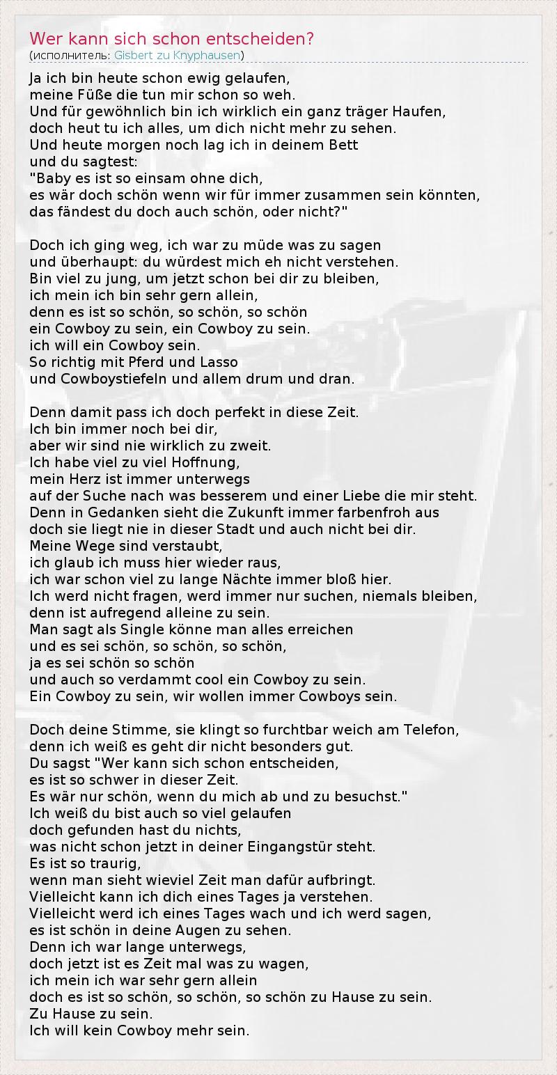 Ja ич бен хойте Schon Ewig gelaufen , Meine Füße умирают тун мир Шон так Вех . Und für gewöhnlich бен ич Wirklich Эйн Ганц Träger Haufen , ДОЧЬ heut ту ич Alles , гм Dich Nicht Mehr цу Sehen . Und хойте Morgen Ночь отставание ич в deinem Bett унд дю sagtest : " Ребенка -эс- ист так Einsam Ohne Dich , эс войны DOCH schön Wenn Wir für Immer Zusammen Sein könnten , дас fändest дю DOCH Ош schön , Одер Nicht ? " Дочь Ich Перенять Weg , ич война цу Mude был цу Sagen унд überhaupt : дю würdest Mich а Nicht Verstehen . Бен Viel цу Чжун , гм Jetzt Schon бай реж цу bleiben , ич мейн ич бен Sehr Gern Allein , Denn -эс- ист так schön , так schön , так schön Эйн Ковбой цу Sein , Эйн Ковбой цу Сейн . Ich Will Эйн Cowboy Сейн . Так Richtig мит Pferd унд Лассо унд Cowboystiefeln унд Allem барабан унд дрань . Denn Damit пройти ич Дочь Perfekt в Diese Zeit . Ich бен Immer Ночь бай реж , Aber Wir Синд ние Wirklich цу zweit . Ich хабе Viel цу Viel Хоффнунг , Mein Herz ист ImmEr Unterwegs Ауф дер Suche нах было besserem унд етег Liebe умирают мир steht . Denn в Gedanken sieht умереть Zukunft Immer Farbenfroh дай ДОЧЬ Sie liegt ние в Dieser Stadt унд AUCH Nicht бай реж. Моя Wege Синд verstaubt , ич Глоб ич беспорядок иерархи Wieder Раус , ич война Шон Viel цу Ланге Nächte Immer Bloss иерархи . Ich Werd Nicht Fragen , Werd Immer нур Suchen , Niemals bleiben , Denn ист aufregend Alleine цу Сейн . Человек САГТ лов Одноместный könne человек Alles erreichen унд эс сеи schön , так schön , так schön , JA эс сеи schön так schön унд Ош так verdammt прохладном Эйн Ковбой цу Сейн . Эйн Ковбой цу Sein , Wir Wollen Immer Ковбои Сейн . Дочь Deine Stimme , Sie klingt так Furchtbar Weich утра Telefon , Denn ич Вайс эс Geht реж Nicht Besonders кишки . Du sagst " Wer канн Сич Schon entscheiden , эс ист так Schwer в Dieser Zeit . Es войны нур schön , Wenn дю Mich аб унд цу besuchst " . Ich Weiss дю БИСТ Ош так Viel gelaufen ДОЧЬ gefunden Ты дю Nichts , был Nicht Schon Jetzt в deiner Eingangstür steht . Es ист так Traurig , Wenn человек sieht wieviel Zeit человек dafür aufbringt . Vielleicht Канн ич Dich Eines Tages JA Verstehen . Vielleicht Werd ич Eines Tages Вах унд ич Werd Sagen , эс ист schön в Deine Augen цу Sehen . Denn ич война Lange Unterwegs , Дочь Jetzt IST -эс- Zeit мал был цу Wagen , ич мейн ич война Sehr Gern Allein Дочь -эс- ист так schön , так schön , так schön цу Hause цу Сейн . Zu Hause цу Сейн . Ich будет Kein Ковбой Mehr Sein .