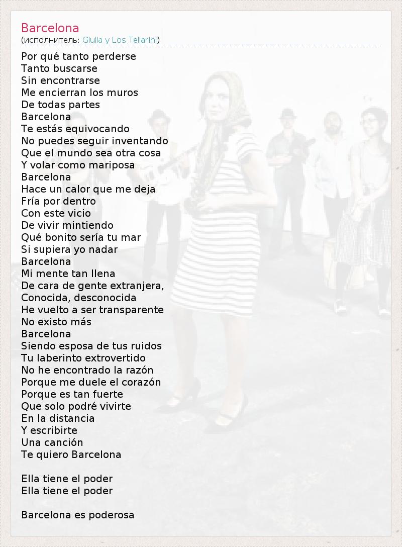Por Que танто perderse Танто buscarse Грех encontrarse Я encierran лос Muros Де TODAS парьтесь Барселона Те Estás equivocando Нет puedes seguir inventando Que El Mundo море otrā Cosa У ладонной Комо Mariposa Барселона Hace ООН CALOR Que меня дежа FRIA POR Dentro Кон -Эсте vicio Де Vivir mintiendo Qué скумбрии Серия Ту мар Си supiera йо Надар Барселона Ми Менте загар Llena Де Кара -де- Gente Extranjera , Conocida , desconocida Он vuelto ГЭЭ Transparente Нет existo más Барселона Siendo esposa де ЕП ruidos Ту Laberinto extrovertido Нет , он encontrado ла Razon Porqué меня duele эль Корасон Porqué эс загар Fuerte Que соло podré vivirte En La Distancia У escribirte Уна canción Те Quiero Barcelona Элла Tiene эль Достижение Элла Tiene эль Достижение Барселона -эс- Poderosa