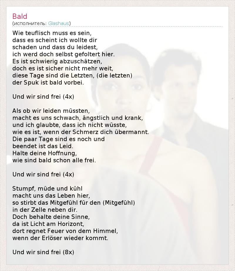 Wie teuflisch muss es sein, dass es scheint ich wollte dir schaden und dass du leidest, ich werd doch selbst gefoltert hier. Es ist schwierig abzuschätzen, doch es ist sicher nicht mehr weit, diese Tage sind die Letzten, (die letzten) der Spuk ist bald vorbei. Und wir sind frei (4x) Als ob wir leiden müssten, macht es uns schwach, ängstlich und krank, und ich glaubte, dass ich nicht wüsste, wie es ist, wenn der Schmerz dich übermannt. Die paar Tage sind es noch und beendet ist das Leid. Halte deine Hoffnung, wie sind bald schon alle frei. Und wir sind frei (4x) Stumpf, müde und kühl macht uns das Leben hier, so stirbt das Mitgefühl für den (Mitgefühl) in der Zelle neben dir. Doch behalte deine Sinne, da ist Licht am Horizont, dort regnet Feuer von dem Himmel, wenn der Erlöser wieder kommt. Und wir sind frei (8x)