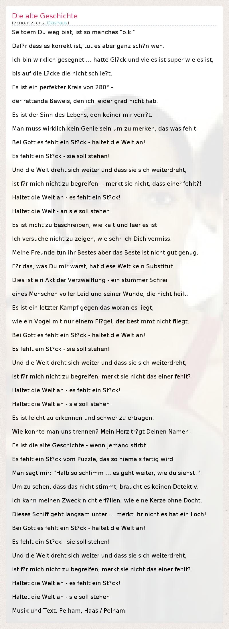 Seitdem Du weg bist, ist so manches "o.k." Daf?r dass es korrekt ist, tut es aber ganz sch?n weh. Ich bin wirklich gesegnet … hatte Gl?ck und vieles ist super wie es ist, bis auf die L?cke die nicht schlie?t. Es ist ein perfekter Kreis von 280° - der rettende Beweis, den ich leider grad nicht hab. Es ist der Sinn des Lebens, den keiner mir verr?t. Man muss wirklich kein Genie sein um zu merken, das was fehlt. Bei Gott es fehlt ein St?ck - haltet die Welt an! Es fehlt ein St?ck - sie soll stehen! Und die Welt dreht sich weiter und dass sie sich weiterdreht, ist f?r mich nicht zu begreifen… merkt sie nicht, dass einer fehlt?! Haltet die Welt an - es fehlt ein St?ck! Haltet die Welt - an sie soll stehen! Es ist nicht zu beschreiben, wie kalt und leer es ist. Ich versuche nicht zu zeigen, wie sehr ich Dich vermiss. Meine Freunde tun ihr Bestes aber das Beste ist nicht gut genug. F?r das, was Du mir warst, hat diese Welt kein Substitut. Dies ist ein Akt der Verzweiflung - ein stummer Schrei eines Menschen voller Leid und seiner Wunde, die nicht heilt. Es ist ein letzter Kampf gegen das woran es liegt; wie ein Vogel mit nur einem Fl?gel, der bestimmt nicht fliegt. Bei Gott es fehlt ein St?ck - haltet die Welt an! Es fehlt ein St?ck - sie soll stehen! Und die Welt dreht sich weiter und dass sie sich weiterdreht, ist f?r mich nicht zu begreifen, merkt sie nicht das einer fehlt?! Haltet die Welt an - es fehlt ein St?ck! Haltet die Welt an - sie soll stehen! Es ist leicht zu erkennen und schwer zu ertragen. Wie konnte man uns trennen? Mein Herz tr?gt Deinen Namen! Es ist die alte Geschichte - wenn jemand stirbt. Es fehlt ein St?ck vom Puzzle, das so niemals fertig wird. Man sagt mir: "Halb so schlimm … es geht weiter, wie du siehst!". Um zu sehen, dass das nicht stimmt, braucht es keinen Detektiv. Ich kann meinen Zweck nicht erf?llen; wie eine Kerze ohne Docht. Dieses Schiff geht langsam unter … merkt ihr nicht es hat ein Loch! Bei Gott es fehlt ein St?ck - haltet die Welt an! Es fehlt ein St?ck - sie soll stehen! Und die Welt dreht sich weiter und dass sie sich weiterdreht, ist f?r mich nicht zu begreifen, merkt sie nicht das einer fehlt?! Haltet die Welt an - es fehlt ein St?ck! Haltet die Welt an - sie soll stehen! Musik und Text: Pelham, Haas / Pelham