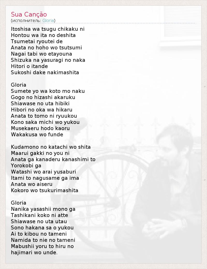 Itoshisa wa tsugu chikaku ni Hontou wa ita no deshita Tsumetai ryoutei de Anata no hoho wo tsutsumi Nagai tabi wo etayouna Shizuka na yasuragi no naka Hitori o itande Sukoshi dake nakimashita Gloria Sumete yo wa koto mo naku Gogo no hizashi akaruku Shiawase no uta hibiki Hibori no oka wa hikaru Anata to tomo ni ryuukou Kono saka michi wo yukou Musekaeru hodo kaoru Wakakusa wo funde Kudamono no katachi wo shita Maarui gakki no you ni Anata ga kanaderu kanashimi to Yorokobi ga Watashi wo arai yusaburi Itami to nagusame ga ima Anata wo aiseru Kokoro wo tsukurimashita Gloria Nanika yasashii mono ga Tashikani koko ni atte Shiawase no uta utau Sono hakana sa o yukou Ai to kibou no tameni Namida to nie no tameni Mabushii yoru to hiru no hajimari wo unde.