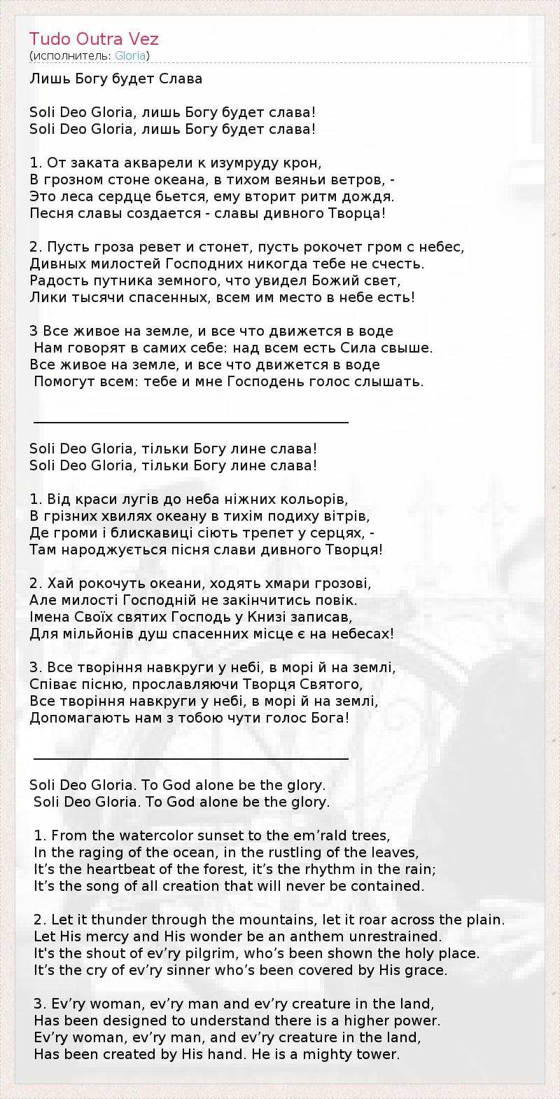 Лишь Богу будет Слава Soli Deo Gloria, лишь Богу будет слава! Soli Deo Gloria, лишь Богу будет слава! 1. От заката акварели к изумруду крон, В грозном стоне океана, в тихом веяньи ветров, - Это леса сердце бьется, ему вторит ритм дождя. Песня славы создается - славы дивного Творца! 2. Пусть гроза ревет и стонет, пусть рокочет гром с небес, Дивных милостей Господних никогда тебе не счесть. Радость путника земного, что увидел Божий свет, Лики тысячи спасенных, всем им место в небе есть! 3 Все живое на земле, и все что движется в воде Нам говорят в самих себе: над всем есть Сила свыше. Все живое на земле, и все что движется в воде Помогут всем: тебе и мне Господень голос слышать. _____________________________________________ Soli Deo Gloria, тільки Богу лине слава! Soli Deo Gloria, тільки Богу лине слава! 1. Від краси лугів до неба ніжних кольорів, В грізних хвилях океану в тихім подиху вітрів, Де громи і блискавиці сіють трепет у серцях, - Там народжується пісня слави дивного Творця! 2. Хай рокочуть океани, ходять хмари грозові, Але милості Господній не закінчитись повік. Імена Своїх святих Господь у Книзі записав, Для мільйонів душ спасенних місце є на небесах! 3. Все творіння навкруги у небі, в морі й на землі, Співає пісню, прославляючи Творця Святого, Все творіння навкруги у небі, в морі й на землі, Допомагають нам з тобою чути голос Бога! _____________________________________________ Soli Deo Gloria. To God alone be the glory. Soli Deo Gloria. To God alone be the glory. 1. From the watercolor sunset to the em’rald trees, In the raging of the ocean, in the rustling of the leaves, It’s the heartbeat of the forest, it’s the rhythm in the rain; It’s the song of all creation that will never be contained. 2. Let it thunder through the mountains, let it roar across the plain. Let His mercy and His wonder be an anthem unrestrained. It's the shout of ev’ry pilgrim, who’s been shown the holy place. It’s the cry of ev’ry sinner who’s been covered by His grace. 3. Ev’ry woman, ev’ry man and ev’ry creature in the land, Has been designed to understand there is a higher power. Ev’ry woman, ev’ry man, and ev’ry creature in the land, Has been created by His hand. He is a mighty tower.