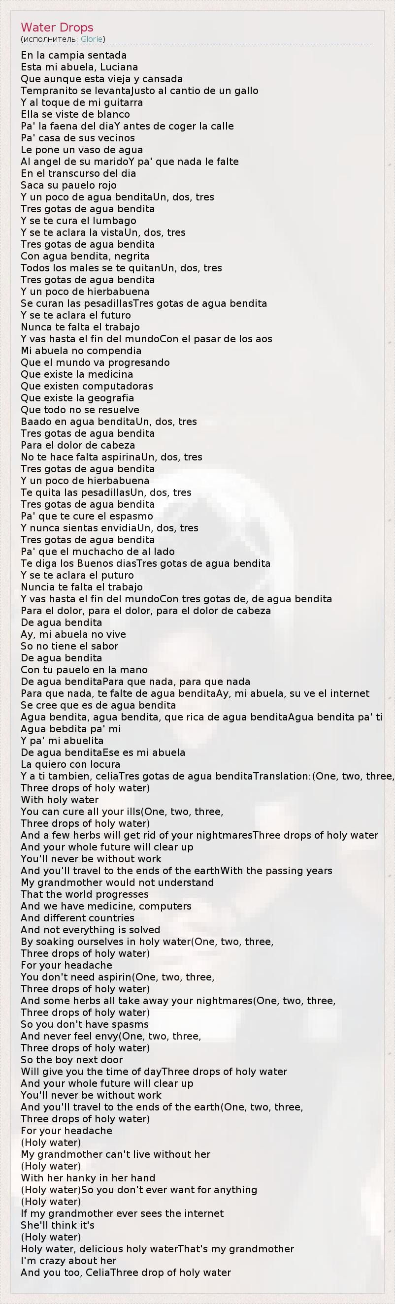 Y a ti tambien, celiaTres gotas de agua benditaTranslation:(One, two, three,