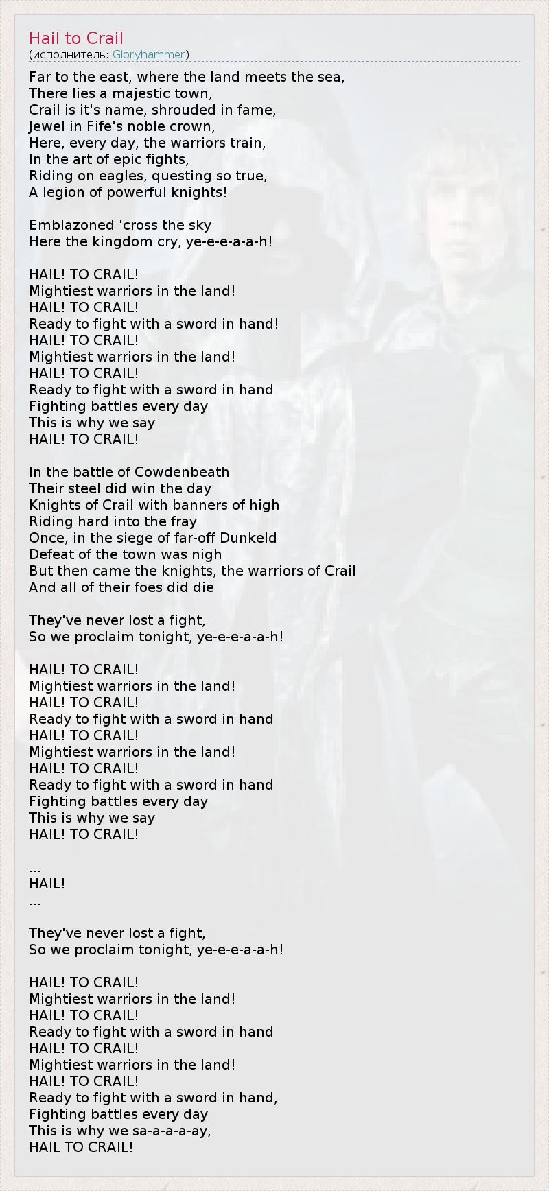 Далеко на востоке, где земля встречает море, Лежит величественный город, Крейл его имя, овеянное славой, Жемчужина в короне Файфа. Здесь каждый день воины тренируются В искусстве великих боёв, Искатели правды, орлов оседлавшие, Могучих воинов легион! Знамёнами рассекают небеса, Где крики королевства слышны, о да-а-а-а-а! Да здравствует Крейл! Сильнейшие воины на этой земле! Да здравствует Крейл! Готовы сражаться с мечом в руках! Да здравствует Крейл! Сильнейшие воины на этой земле! Да здравствует Крейл! Готовы сражаться с мечом в руках! Сражаются каждый день, Вот почему мы говорим: Да здравствует Крейл! В битве под Каудэнбэфом Их сталь выиграла день, Рыцари Крейла с высокими знамёнами В схватку без страха вступают. Однажды, на осаде далекого Данкелда Поражение города было близко, Но тогда прибыли рыцари, воины Крейла, И все их противники погибли. Они не проиграли ни одного сражения, Так что мы провозгласим этой ночью, о да-а-а-а-а: Да здравствует Крейл! Сильнейшие воины на этой земле! Да здравствует Крейл! Готовы сражаться с мечом в руках! Да здравствует Крейл! Сильнейшие воины на этой земле! Да здравствует Крейл! Готовы сражаться с мечом в руках! Сражаются каждый день, Вот почему мы говорим: Да здравствует Крейл! ... Да здравствует Крейл! ... Они не проиграли ни одного сражения, Так что мы провозгласим этой ночью, о да-а-а-а-а: Да здравствует Крейл! Сильнейшие воины на этой земле! Да здравствует Крейл! Готовы сражаться с мечом в руках! Да здравствует Крейл! Сильнейшие воины на этой земле! Да здравствует Крейл! Готовы сражаться с мечом в руках! Сражаются каждый день, Вот почему мы говорим: Да здравствует Крейл!