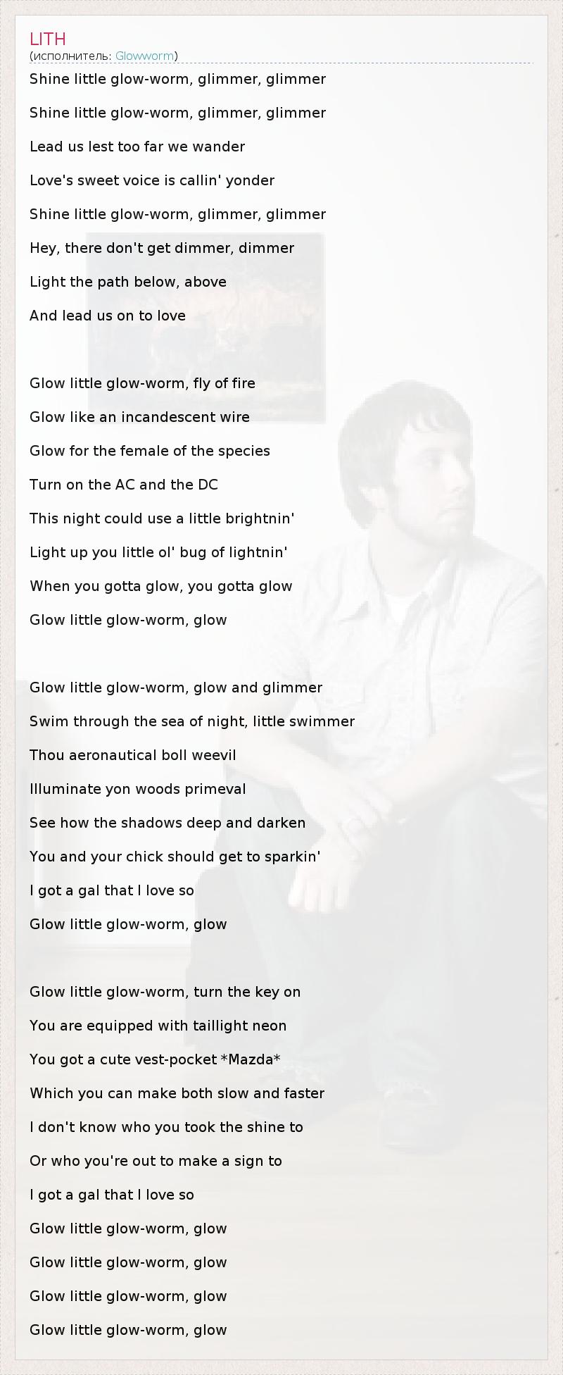 Shine little glow-worm, glimmer, glimmer Shine little glow-worm, glimmer, glimmer Lead us lest too far we wander Love's sweet voice is callin' yonder Shine little glow-worm, glimmer, glimmer Hey, there don't get dimmer, dimmer Light the path below, above And lead us on to love Glow little glow-worm, fly of fire Glow like an incandescent wire Glow for the female of the species Turn on the AC and the DC This night could use a little brightnin' Light up you little ol' bug of lightnin' When you gotta glow, you gotta glow Glow little glow-worm, glow Glow little glow-worm, glow and glimmer Swim through the sea of night, little swimmer Thou aeronautical boll weevil Illuminate yon woods primeval See how the shadows deep and darken You and your chick should get to sparkin' I got a gal that I love so Glow little glow-worm, glow Glow little glow-worm, turn the key on You are equipped with taillight neon You got a cute vest-pocket *Mazda* Which you can make both slow and faster I don't know who you took the shine to Or who you're out to make a sign to I got a gal that I love so Glow little glow-worm, glow Glow little glow-worm, glow Glow little glow-worm, glow Glow little glow-worm, glow