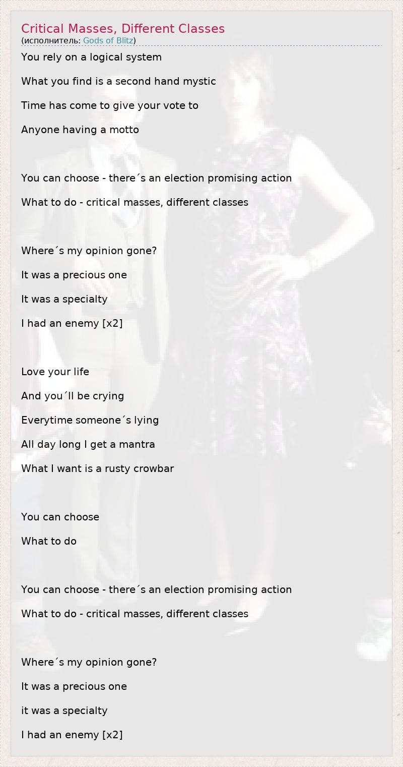 А как ты думаешь, о чем песня "Critical Masses, Different Classes" ?