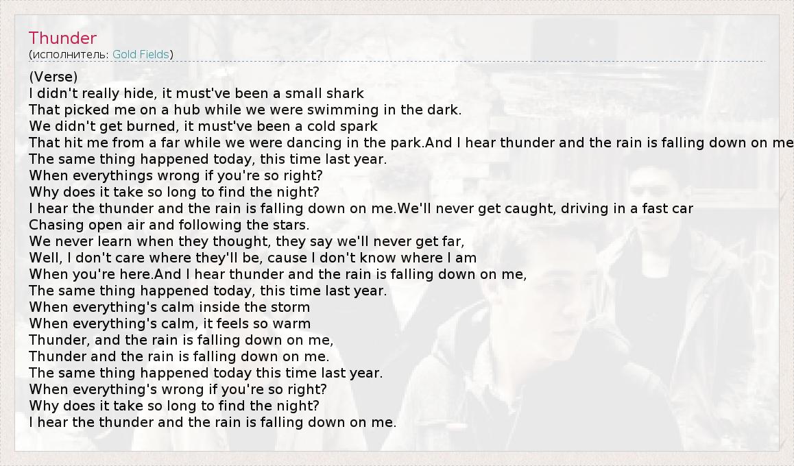 (Verse) I didn't really hide, it must've been a small shark That picked me on a hub while we were swimming in the dark. We didn't get burned, it must've been a cold spark That hit me from a far while we were dancing in the park.And I hear thunder and the rain is falling down on me The same thing happened today, this time last year. When everythings wrong if you're so right? Why does it take so long to find the night? I hear the thunder and the rain is falling down on me.We'll never get caught, driving in a fast car Chasing open air and following the stars. We never learn when they thought, they say we'll never get far, Well, I don't care where they'll be, cause I don't know where I am When you're here.And I hear thunder and the rain is falling down on me, The same thing happened today, this time last year. When everything's calm inside the storm When everything's calm, it feels so warm Thunder, and the rain is falling down on me, Thunder and the rain is falling down on me. The same thing happened today this time last year. When everything's wrong if you're so right? Why does it take so long to find the night? I hear the thunder and the rain is falling down on me.