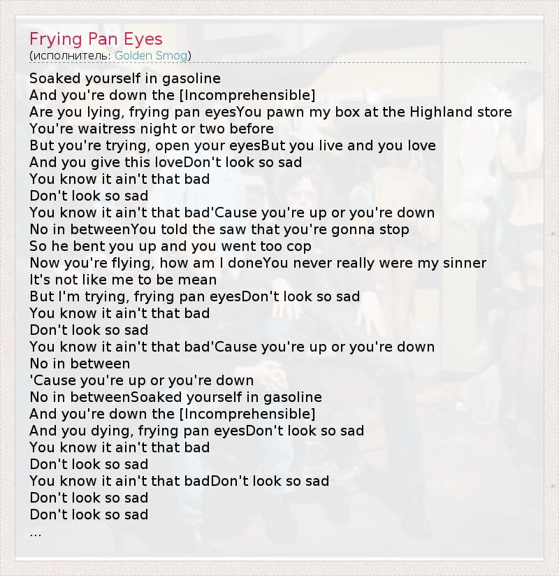 Soaked yourself in gasoline And you're down the [Incomprehensible] Are you lying, frying pan eyesYou pawn my box at the Highland store You're waitress night or two before But you're trying, open your eyesBut you live and you love And you give this loveDon't look so sad You know it ain't that bad Don't look so sad You know it ain't that bad'Cause you're up or you're down No in betweenYou told the saw that you're gonna stop So he bent you up and you went too cop Now you're flying, how am I doneYou never really were my sinner It's not like me to be mean But I'm trying, frying pan eyesDon't look so sad You know it ain't that bad Don't look so sad You know it ain't that bad'Cause you're up or you're down No in between 'Cause you're up or you're down No in betweenSoaked yourself in gasoline And you're down the [Incomprehensible] And you dying, frying pan eyesDon't look so sad You know it ain't that bad Don't look so sad You know it ain't that badDon't look so sad Don't look so sad Don't look so sad ...