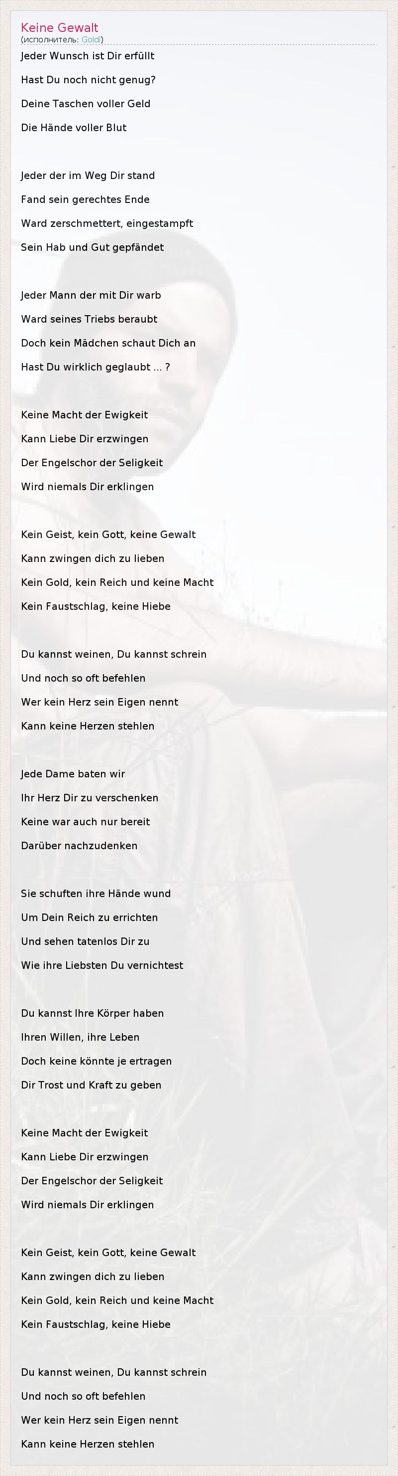 Jeder Wunsch ist Dir erfüllt Hast Du noch nicht genug? Deine Taschen voller Geld Die Hände voller Blut Jeder der im Weg Dir stand Fand sein gerechtes Ende Ward zerschmettert, eingestampft Sein Hab und Gut gepfändet Jeder Mann der mit Dir warb Ward seines Triebs beraubt Doch kein Mädchen schaut Dich an Hast Du wirklich geglaubt ... ? Keine Macht der Ewigkeit Kann Liebe Dir erzwingen Der Engelschor der Seligkeit Wird niemals Dir erklingen Kein Geist, kein Gott, keine Gewalt Kann zwingen dich zu lieben Kein Gold, kein Reich und keine Macht Kein Faustschlag, keine Hiebe Du kannst weinen, Du kannst schrein Und noch so oft befehlen Wer kein Herz sein Eigen nennt Kann keine Herzen stehlen Jede Dame baten wir Ihr Herz Dir zu verschenken Keine war auch nur bereit Darüber nachzudenken Sie schuften ihre Hände wund Um Dein Reich zu errichten Und sehen tatenlos Dir zu Wie ihre Liebsten Du vernichtest Du kannst Ihre Körper haben Ihren Willen, ihre Leben Doch keine könnte je ertragen Dir Trost und Kraft zu geben Keine Macht der Ewigkeit Kann Liebe Dir erzwingen Der Engelschor der Seligkeit Wird niemals Dir erklingen Kein Geist, kein Gott, keine Gewalt Kann zwingen dich zu lieben Kein Gold, kein Reich und keine Macht Kein Faustschlag, keine Hiebe Du kannst weinen, Du kannst schrein Und noch so oft befehlen Wer kein Herz sein Eigen nennt Kann keine Herzen stehlen