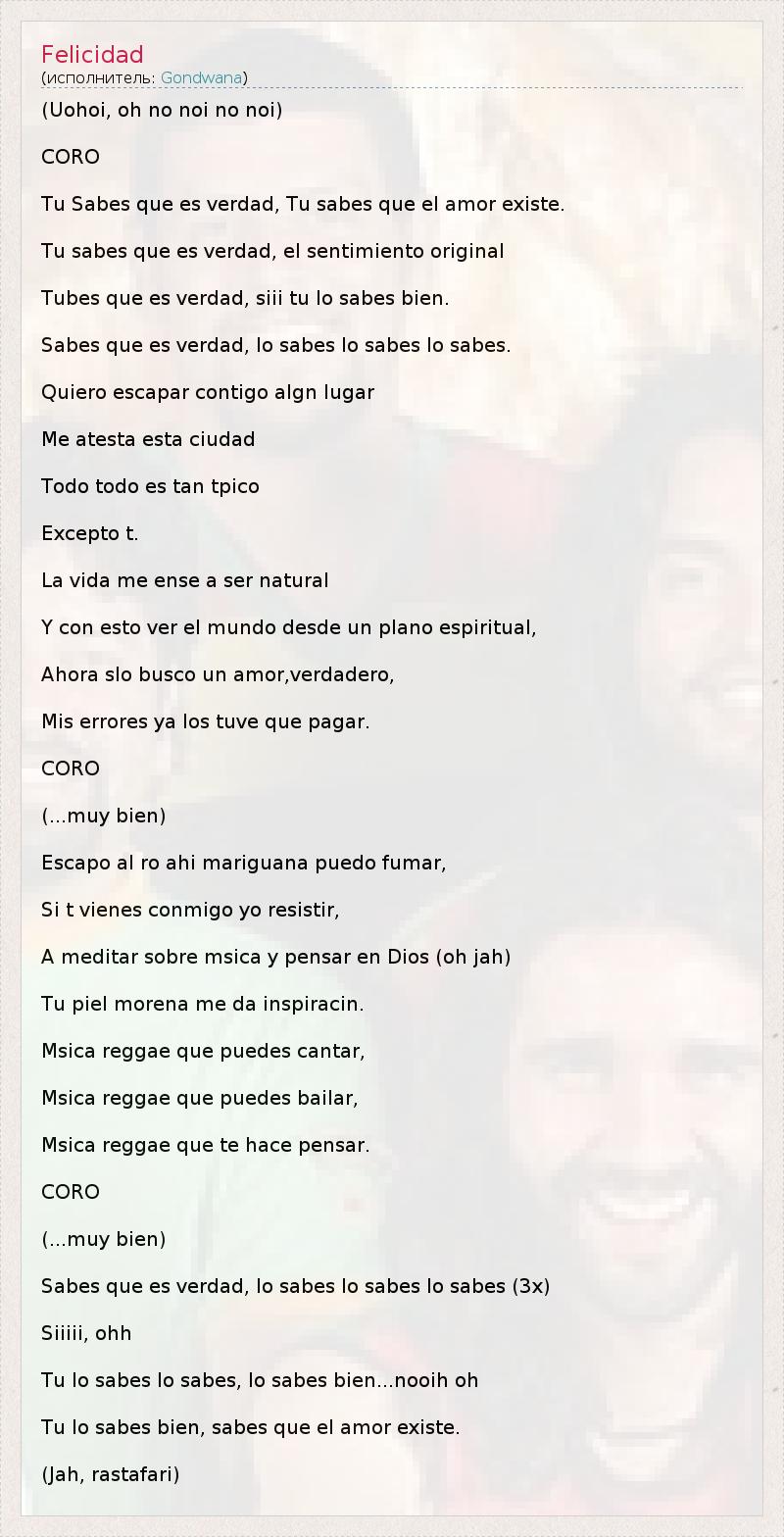 (Uohoi, oh no noi no noi) CORO Tu Sabes que es verdad, Tu sabes que el amor existe. Tu sabes que es verdad, el sentimiento original Tubes que es verdad, siii tu lo sabes bien. Sabes que es verdad, lo sabes lo sabes lo sabes. Quiero escapar contigo algn lugar Me atesta esta ciudad Todo todo es tan tpico Excepto t. La vida me ense a ser natural Y con esto ver el mundo desde un plano espiritual, Ahora slo busco un amor,verdadero, Mis errores ya los tuve que pagar. CORO (...muy bien) Escapo al ro ahi mariguana puedo fumar, Si t vienes conmigo yo resistir, A meditar sobre msica y pensar en Dios (oh jah) Tu piel morena me da inspiracin. Msica reggae que puedes cantar, Msica reggae que puedes bailar, Msica reggae que te hace pensar. CORO (...muy bien) Sabes que es verdad, lo sabes lo sabes lo sabes (3x) Siiiii, ohh Tu lo sabes lo sabes, lo sabes bien...nooih oh Tu lo sabes bien, sabes que el amor existe. (Jah, rastafari)
