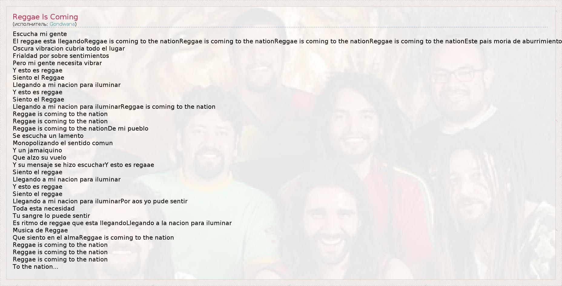 Escucha mi gente El reggae esta llegandoReggae is coming to the nationReggae is coming to the nationReggae is coming to the nationReggae is coming to the nationEste pais moria de aburrimiento Oscura vibracion cubria todo el lugar Frialdad por sobre sentimientos Pero mi gente necesita vibrar Y esto es reggae Siento el Reggae Llegando a mi nacion para iluminar Y esto es reggae Siento el Reggae Llegando a mi nacion para iluminarReggae is coming to the nation Reggae is coming to the nation Reggae is coming to the nation Reggae is coming to the nationDe mi pueblo Se escucha un lamento Monopolizando el sentido comun Y un jamaiquino Que alzo su vuelo Y su mensaje se hizo escucharY esto es regaae Siento el reggae Llegando a mi nacion para iluminar Y esto es reggae Siento el reggae Llegando a mi nacion para iluminarPor aos yo pude sentir Toda esta necesidad Tu sangre lo puede sentir Es ritmo de reggae que esta llegandoLlegando a la nacion para iluminar Musica de Reggae Que siento en el almaReggae is coming to the nation Reggae is coming to the nation Reggae is coming to the nation Reggae is coming to the nation To the nation...