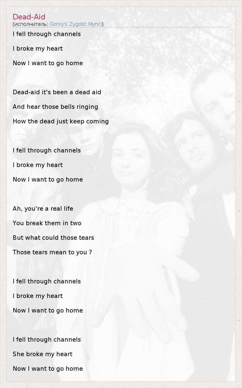I fell through channels I broke my heart Now I want to go home Dead-aid it's been a dead aid And hear those bells ringing How the dead just keep coming I fell through channels I broke my heart Now I want to go home Ah, you're a real life You break them in two But what could those tears Those tears mean to you ? I fell through channels I broke my heart Now I want to go home I fell through channels She broke my heart Now I want to go home