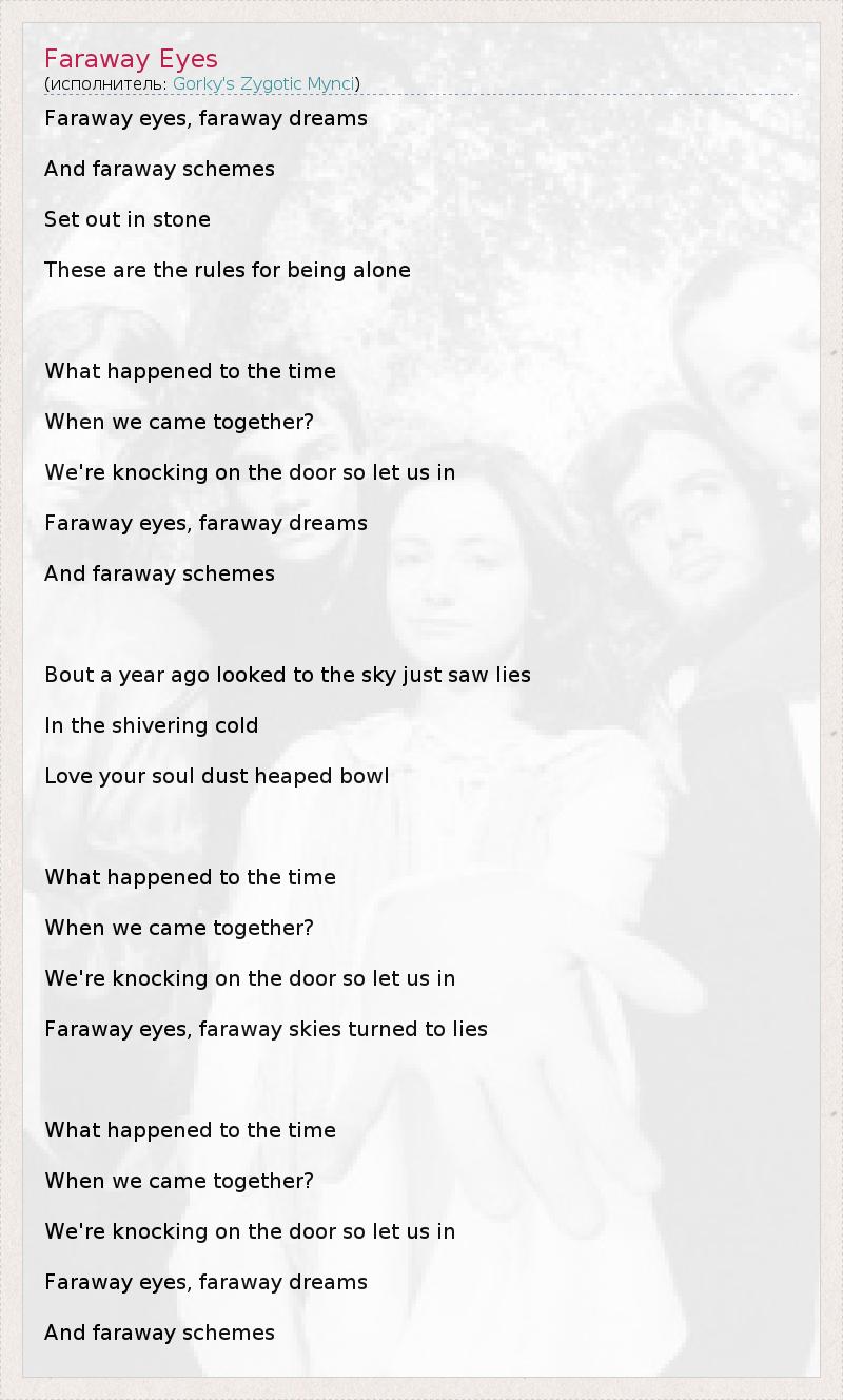 Faraway eyes, faraway dreams And faraway schemes Set out in stone These are the rules for being alone What happened to the time When we came together? We're knocking on the door so let us in Faraway eyes, faraway dreams And faraway schemes Bout a year ago looked to the sky just saw lies In the shivering cold Love your soul dust heaped bowl What happened to the time When we came together? We're knocking on the door so let us in Faraway eyes, faraway skies turned to lies What happened to the time When we came together? We're knocking on the door so let us in Faraway eyes, faraway dreams And faraway schemes