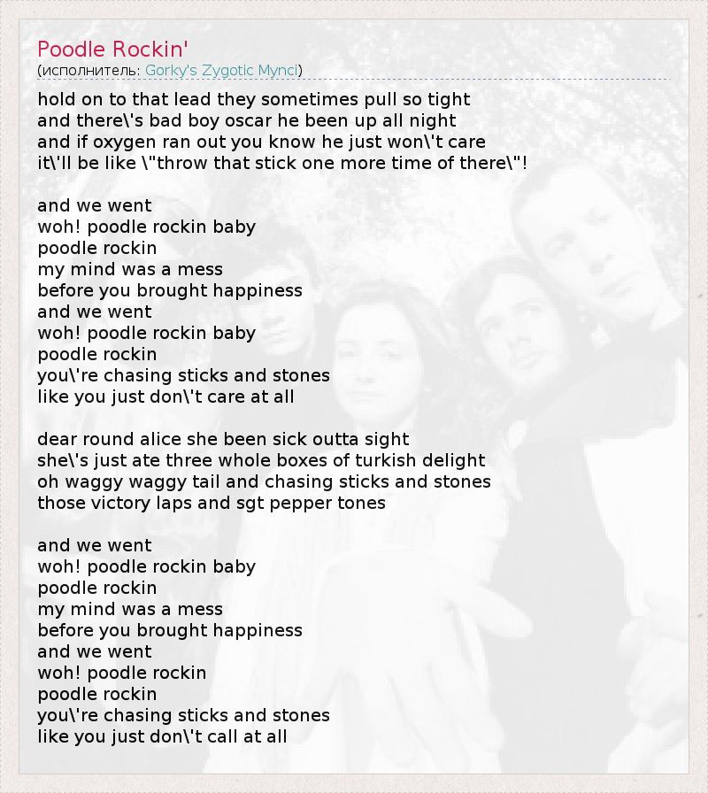 hold on to that lead they sometimes pull so tight and there\'s bad boy oscar he been up all night and if oxygen ran out you know he just won\'t care it\'ll be like \"throw that stick one more time of there\"! and we went woh! poodle rockin baby poodle rockin my mind was a mess before you brought happiness and we went woh! poodle rockin baby poodle rockin you\'re chasing sticks and stones like you just don\'t care at all dear round alice she been sick outta sight she\'s just ate three whole boxes of turkish delight oh waggy waggy tail and chasing sticks and stones those victory laps and sgt pepper tones and we went woh! poodle rockin baby poodle rockin my mind was a mess before you brought happiness and we went woh! poodle rockin poodle rockin you\'re chasing sticks and stones like you just don\'t call at all
