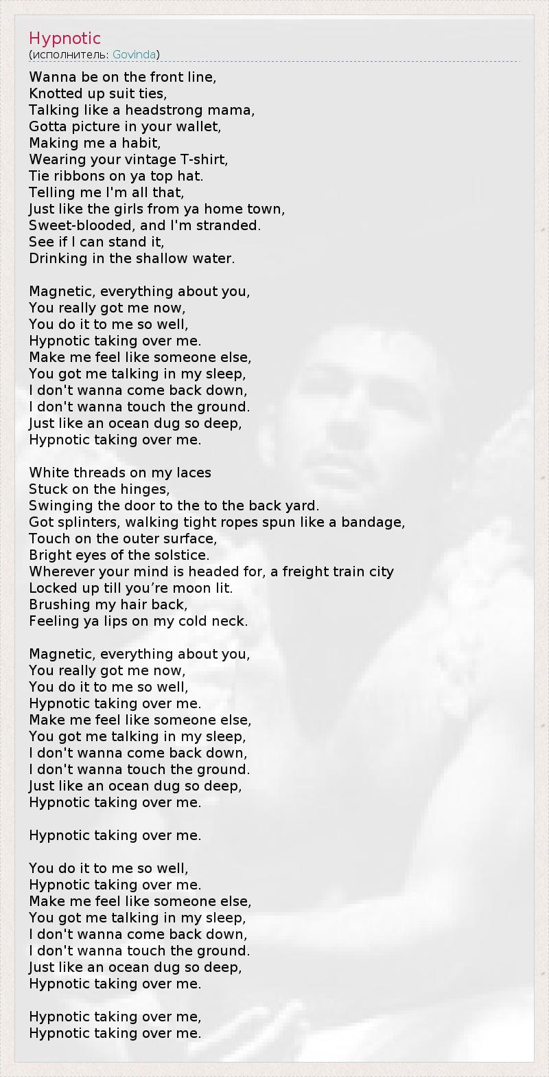 Хочешь красоваться на передней полосе В завязанном галстуке, А говоришь, как строгая мамочка. В твоём бумажнике лежит фотография. Я вхожу у тебя в привычку: Ношу твою винтажную футболку, Завязываю ленты на твоём цилиндре. Ты говоришь, что я в точности такая, Как девушки из твоего родного города — Моя кровь сладкая на вкус, и я в замешательстве. Посмотрим, смогу ли я Напиться на мелководье. Всё в тебе притягивает, Ты заворожил меня, Ты идеально очаровываешь меня, Гипноз захватывает меня. Я чувствую себя другой, Из-за тебя я говорю во сне, Я не хочу приходить в себя, Я не хочу спускаться на землю. Глубокий, словно пучины океана, Гипноз захватывает меня. Белые нити на моих кружевах Зацепились за дверные петли, Раскачивающие дверь на задний двор. Весь в занозах идёшь по канату, перекрученному словно бинт, Доходишь до внешней границы, Ярких глаз солнцестояния. Куда бы ни были устремлены твои мысли, город грузовых поездов Будет заперт до восхода луны. Я поправляю причёску, Чувствую твои губы на своей холодной шее. Всё в тебе притягивает, Ты заворожил меня, Ты идеально очаровываешь меня, Гипноз захватывает меня. Я чувствую себя другой, Из-за тебя я говорю во сне, Я не хочу приходить в себя, Я не хочу спускаться на землю. Глубокий, словно пучины океана, Гипноз захватывает меня. Гипноз захватывает меня. Ты идеально очаровываешь меня, Гипноз захватывает меня. Я чувствую себя другой, Из-за тебя я говорю во сне, Я не хочу приходить в себя, Я не хочу спускаться на землю. Глубокий, словно пучины океана, Гипноз захватывает меня. Гипноз захватывает меня, Гипноз захватывает меня.